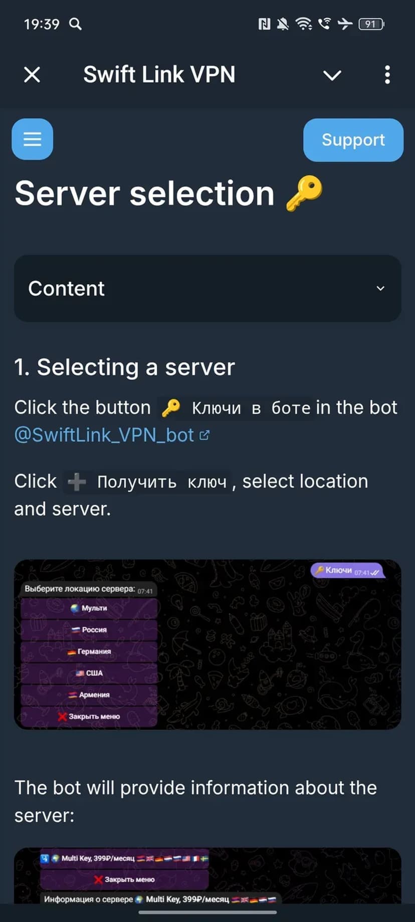 - Генерация ключей: в зависимости от типа сервера вы получаете либо динамически сгенерированный ключ для Outline VPN, либо подробную инструкцию с уникальной ссылкой для подключения.