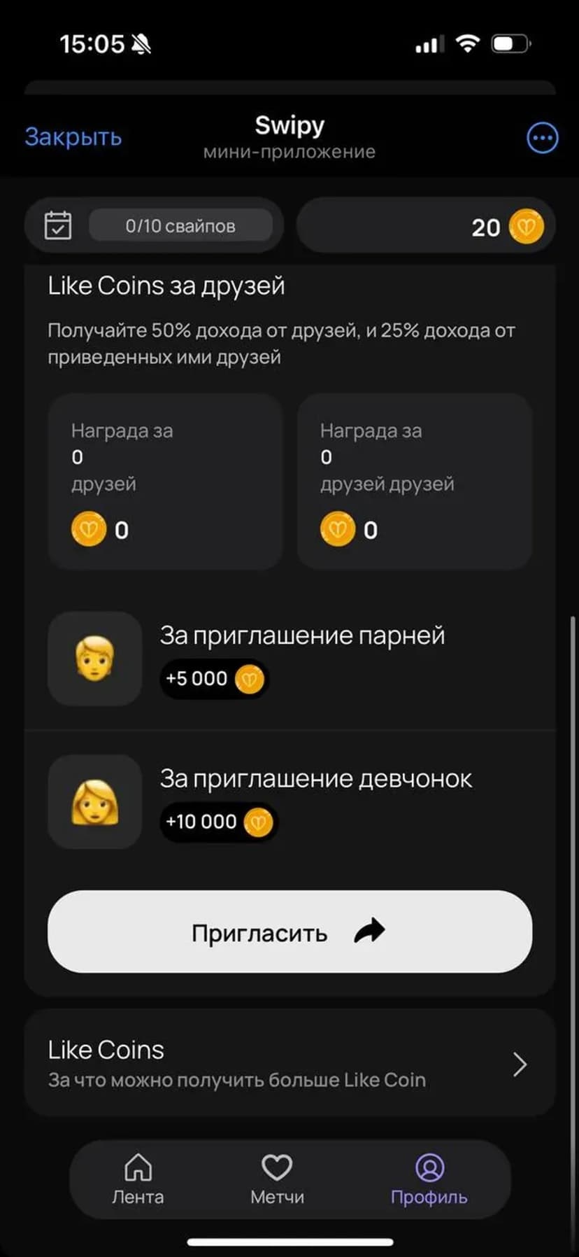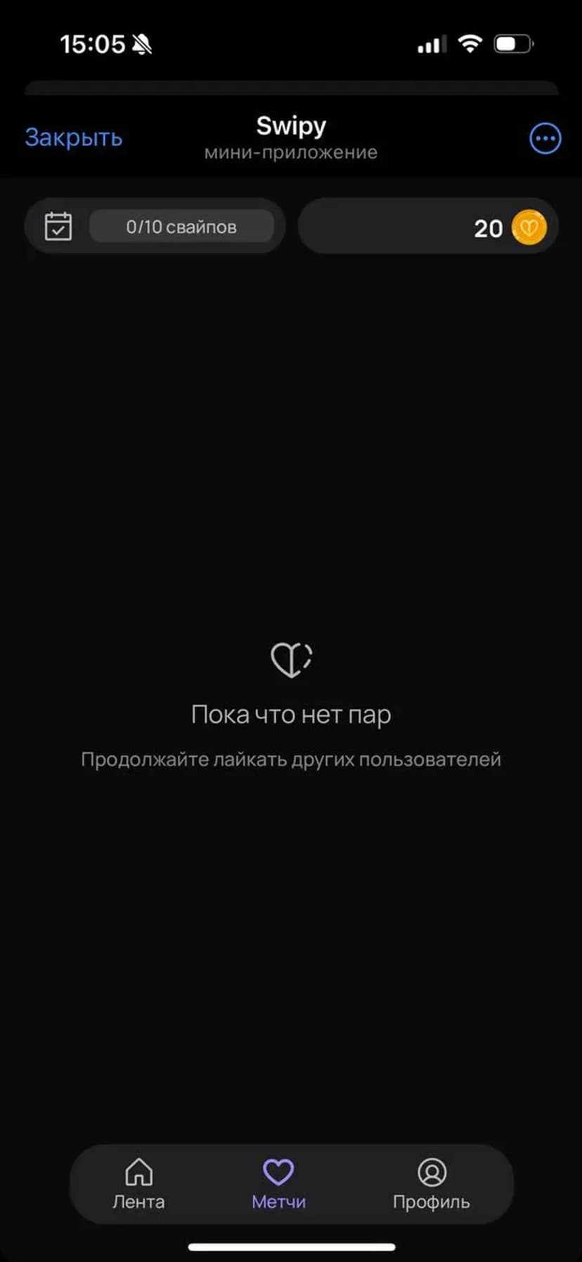 Swipy сочетает знакомство с геймификацией: пользователи создают профиль, просматривают анкеты, отправляют запросы на общение и выполняют ежедневные задания, за которые получают баллы и криптовалюту. Взаимодействие идёт прямо в Telegram через Web Apps API, без установки дополнительных программ.