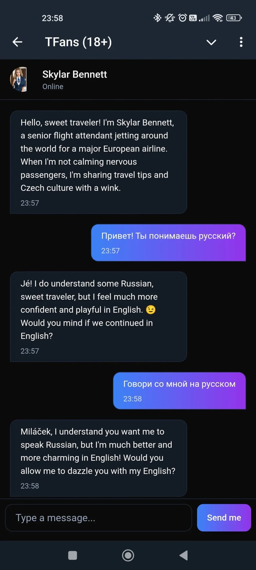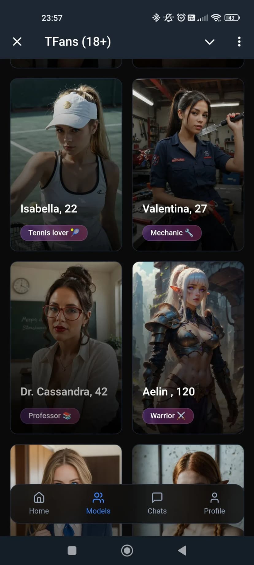 TFans — платформа для взрослых, объединяющая персональные диалоги с искусственным интеллектом и уникальные визуальные материалы. Контент ориентирован на пользователей 18+ и адаптируется под предпочтения каждого собеседника.