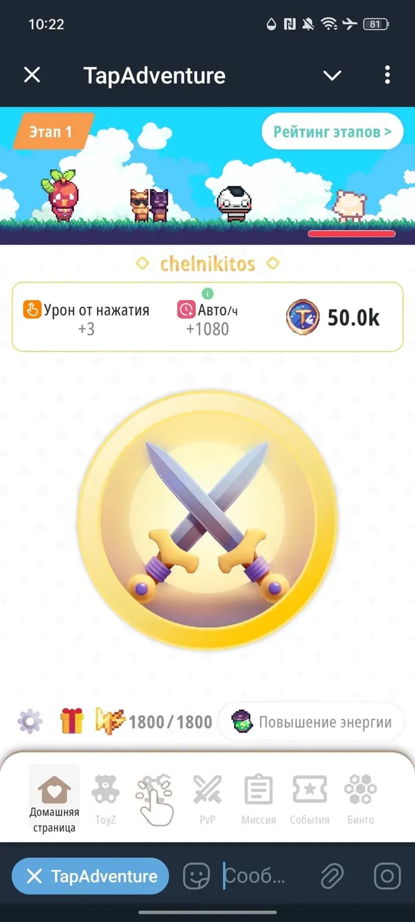TapAdventure — кликер-RPG: ведите героя через этапы, сражайтесь с врагами, собирайте лут и открывайте новые уровни, улучшая экипировку.