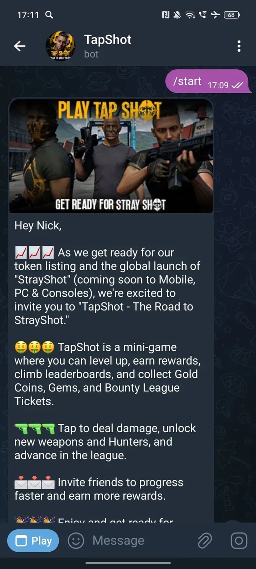 TapShot — динамичная мини‑игра в Telegram с механикой быстрого тапа: нажимаете на экран, чтобы атаковать и получать внутриигровые ресурсы. Открывайте новое оружие и персонажей (Hunters) и продвигайтесь по лигам, соревнуясь с другими игроками.