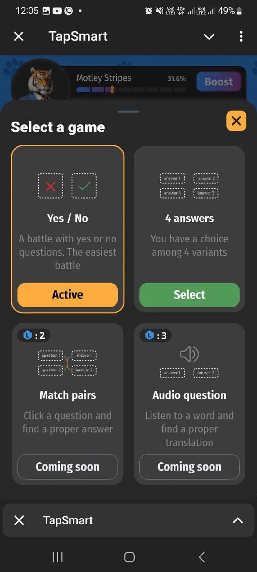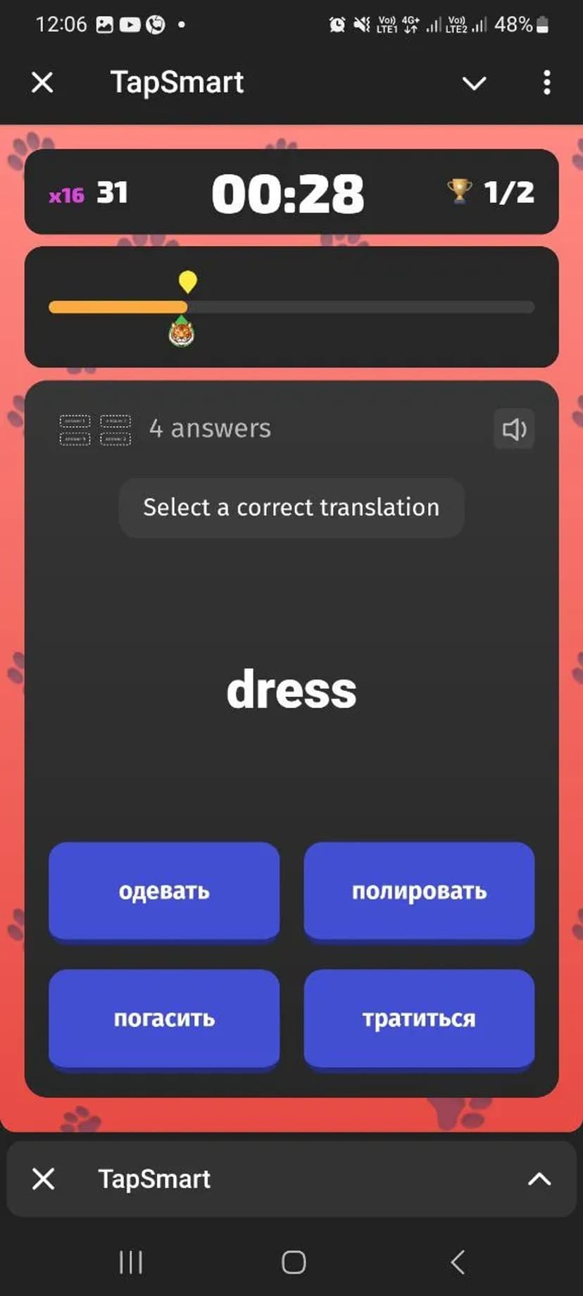 TapSmart позволяет отрабатывать словарный запас на 42 языках с помощью коротких викторин и мгновенной проверки ответов. Упражнения ориентированы на быстрое повторение слов и соревновательный формат.