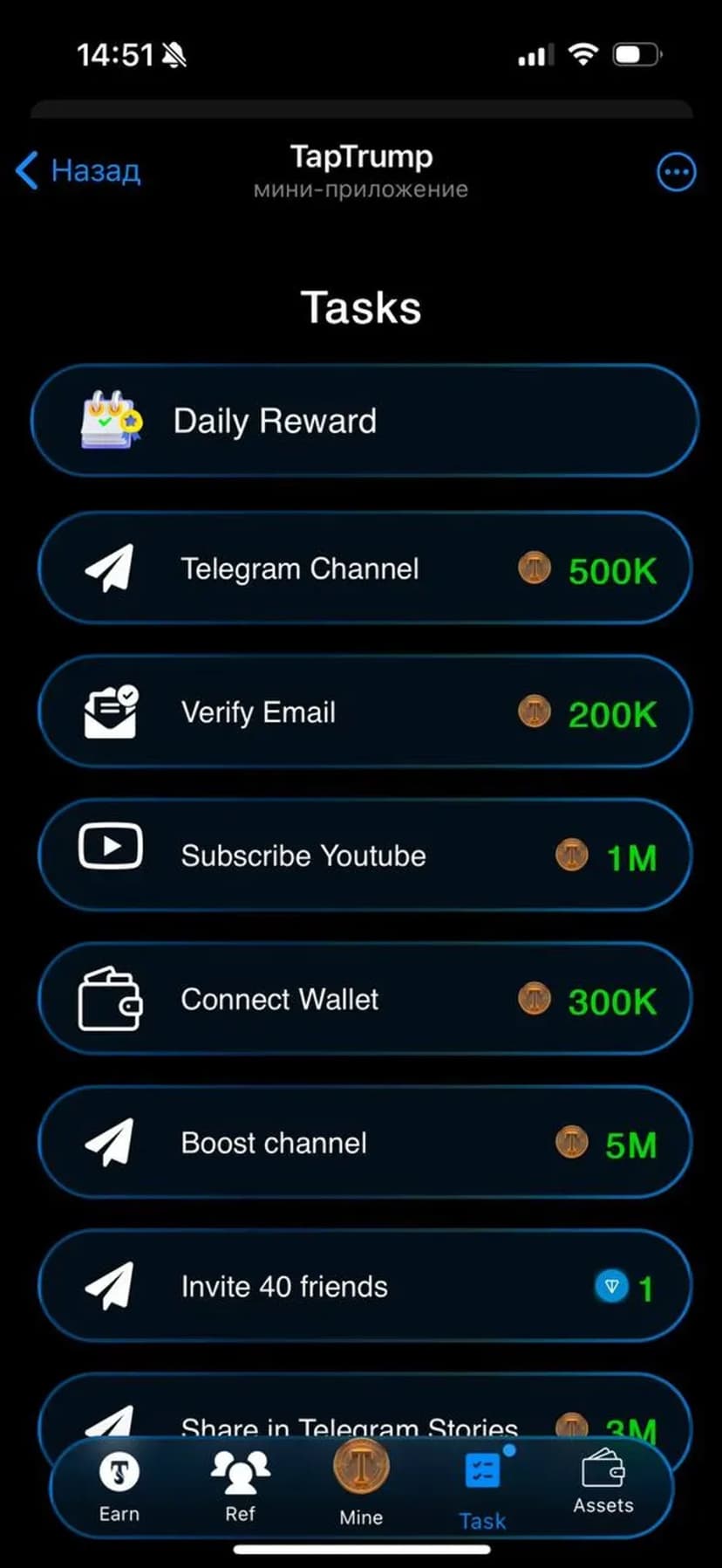 TapTrump — кликер с карточной прокачкой и элементами геймификации на блокчейне TON. Игрок начинает с начального этапа жизненного пути персонажа и стремится достичь поста президента США.