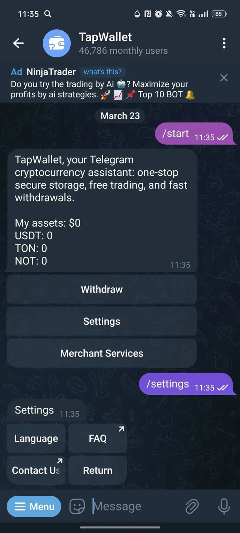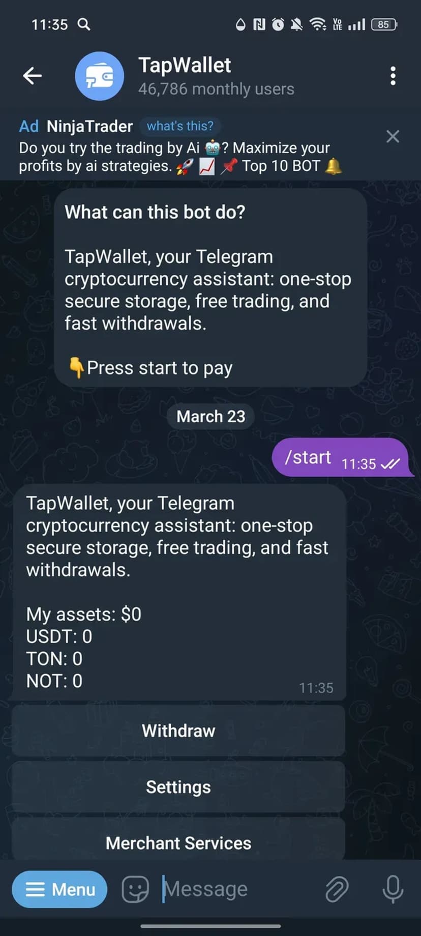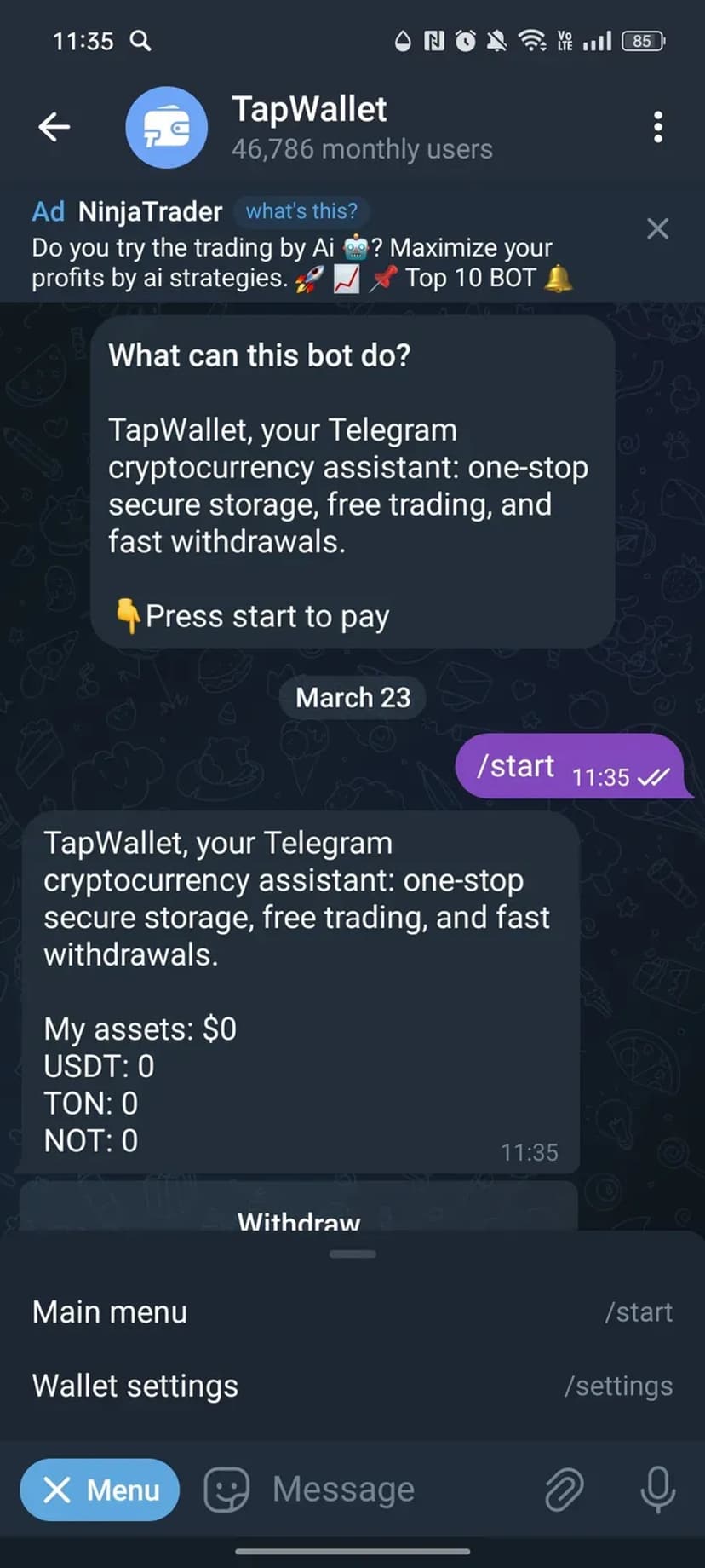 - Плюсы: прямой доступ к кошельку из мессенджера, быстрый обмен и вывод средств, отсутствие необходимости в отдельной регистрации