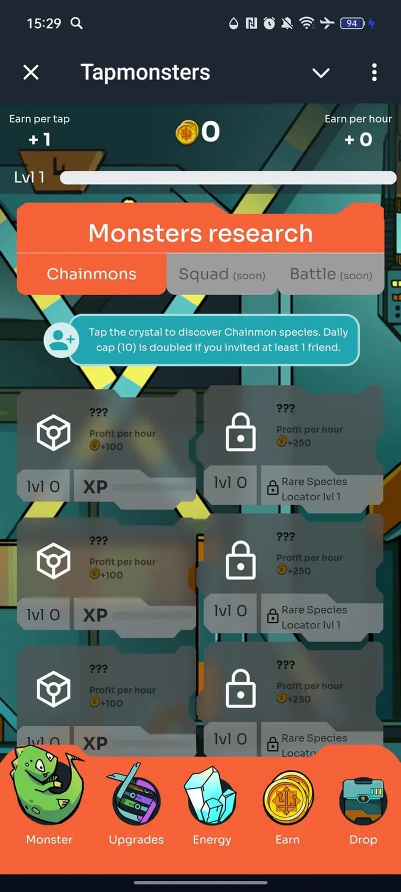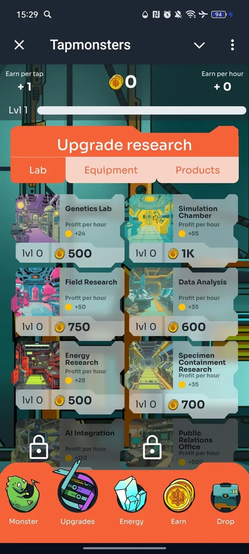 Tapmonsters — симулятор лаборатории внутри Telegram, где вы управляете развитием лаборатории N‑Corp, выполняете задания и добываете внутриигровую валюту $MONSTER.