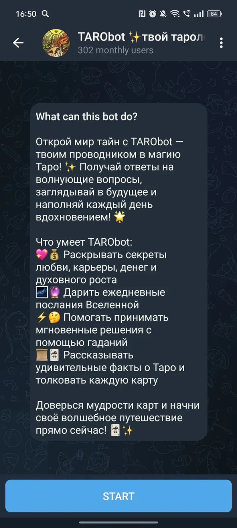 TARObot ✨твой таролог — бот для быстрых раскладов Таро в Telegram. Он формирует расклад по вашему запросу и выдаёт интерпретацию, опираясь на заранее подготовленные сценарии и психологические нюансы ситуации.