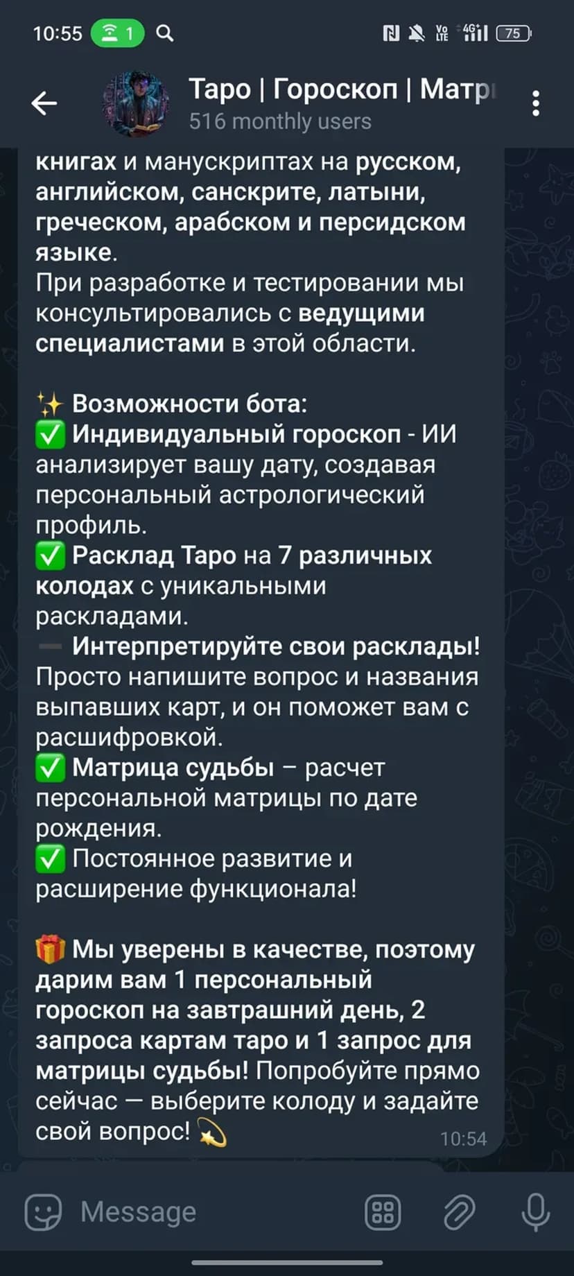 Tarotolog AI — удобный инструмент в Telegram для персонального гороскопа, Таро и расчёта Матрицы Судьбы. Интерфейс основан на командах бота: при запуске открывается меню с основными функциями. Все вычисления и интерпретации выполняются AI‑модулем, обученным на корпусе более 300 профильных источников.