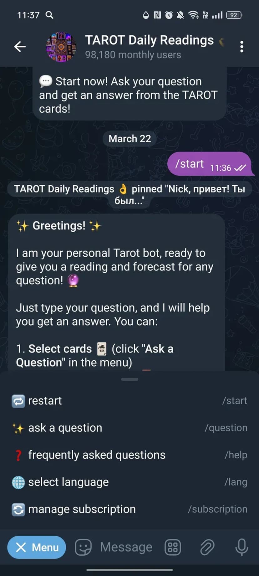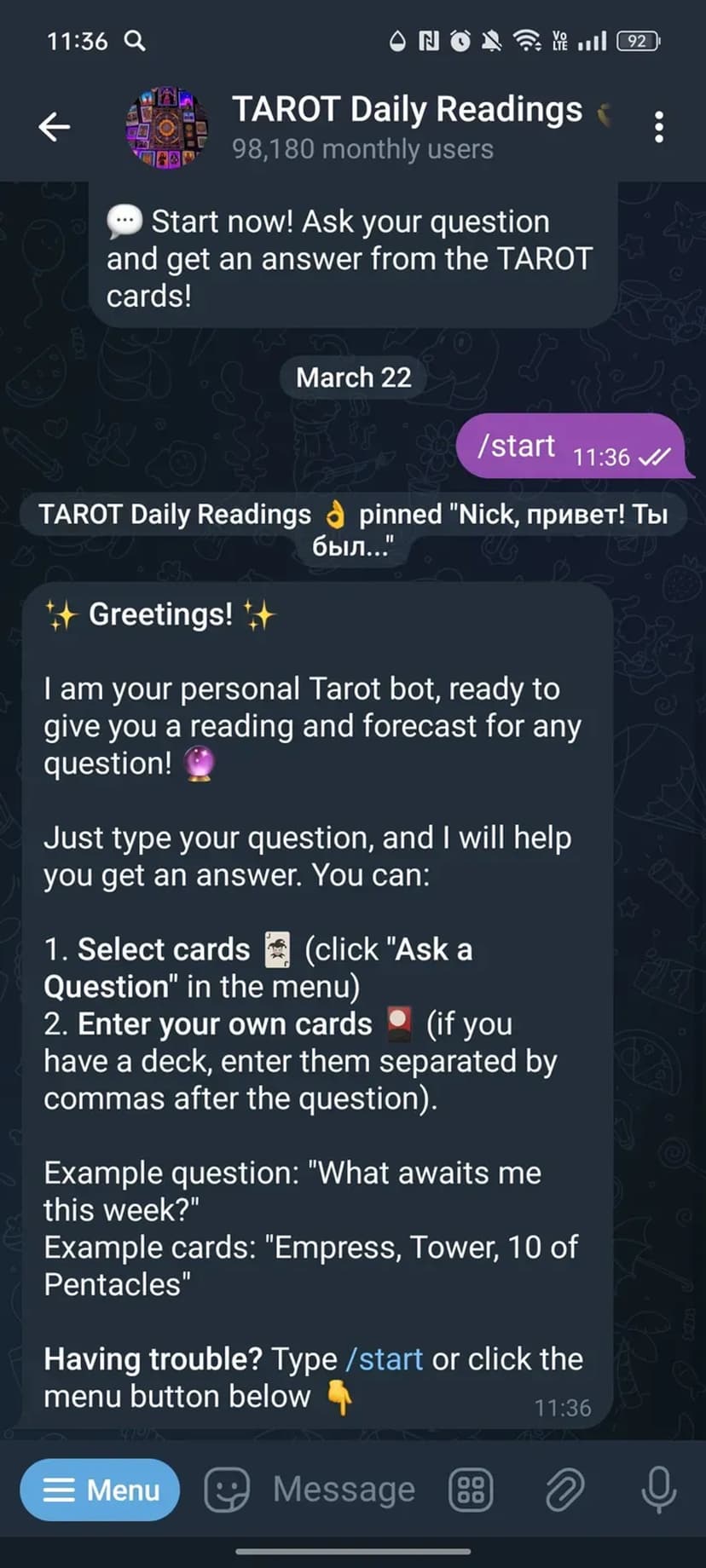 - Запросы и выбор расклада: выберите «Задать вопрос» в меню — бот предложит вытянуть карты или ввести свои позиции.