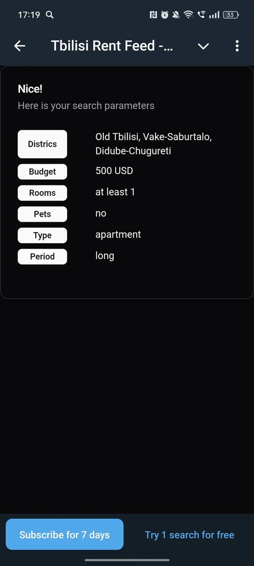 - Результаты прямо в чате: удобный оперативный просмотр и быстрая связь с арендодателями.