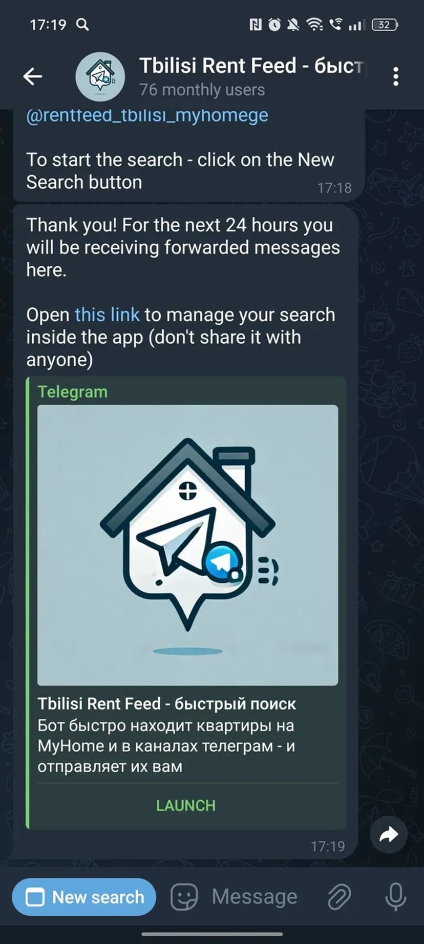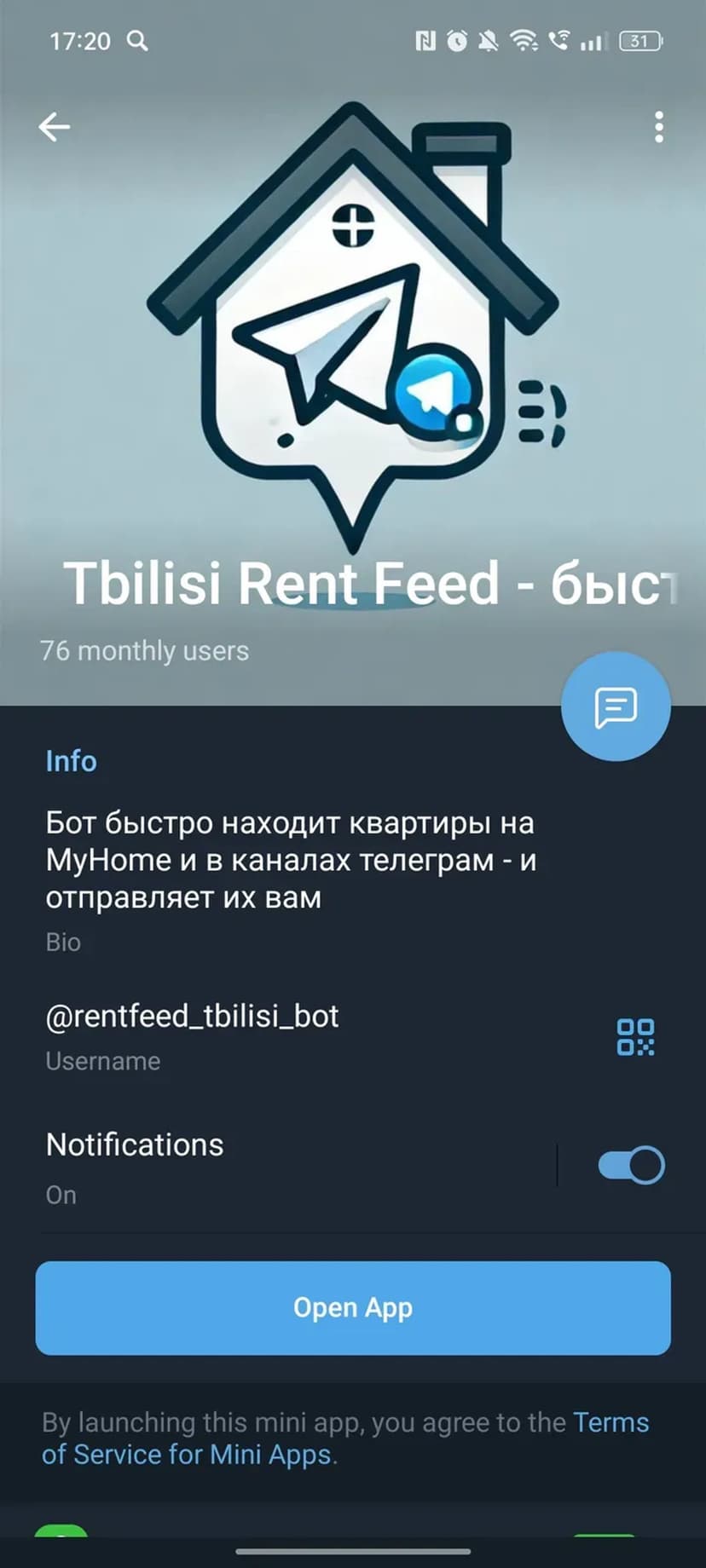 *Нажимая "Открыть в Telegram", вы перейдете к приложению Tbilisi Rent Feed - быстрый поиск в мессенджере Telegram