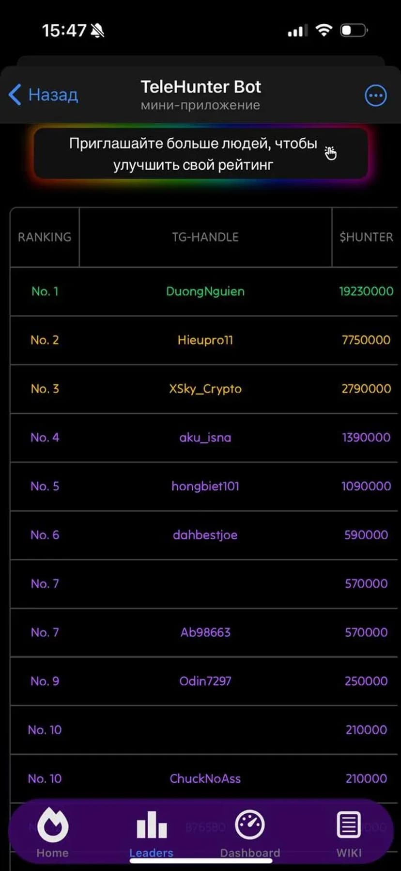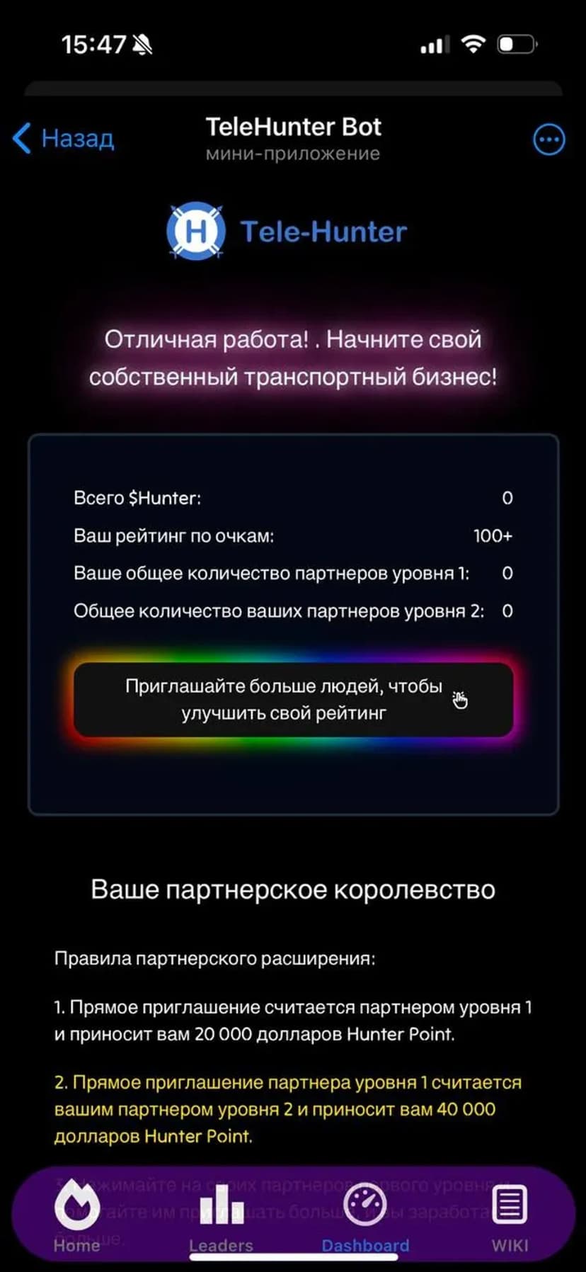 - Автоматическое начисление Hunter Points при приходе новых пользователей по реферальной ссылке.