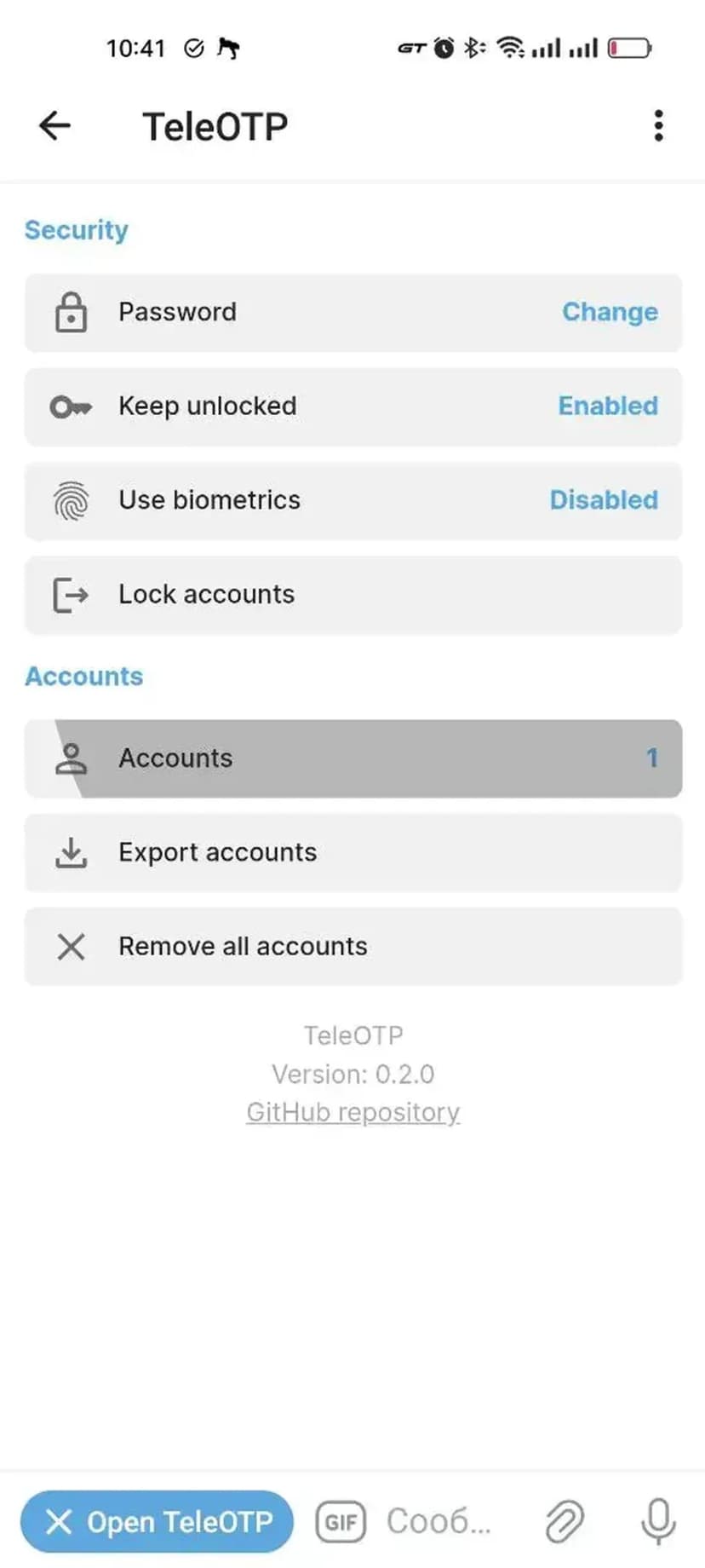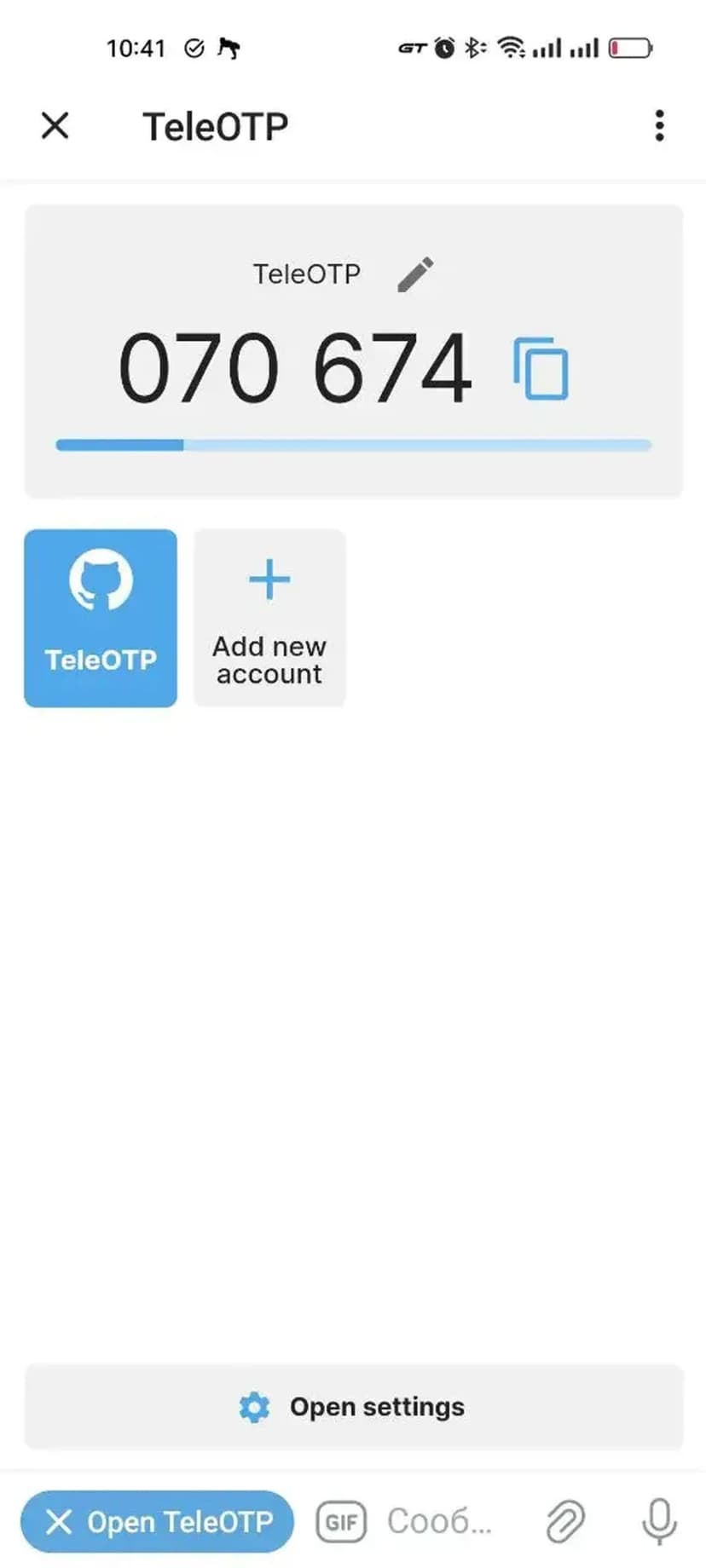 TeleOTP позволяет получать одноразовые пароли для двухфакторной аутентификации (2FA/OTP) без установки дополнительных программ — все коды генерируются прямо в вашем мессенджере.