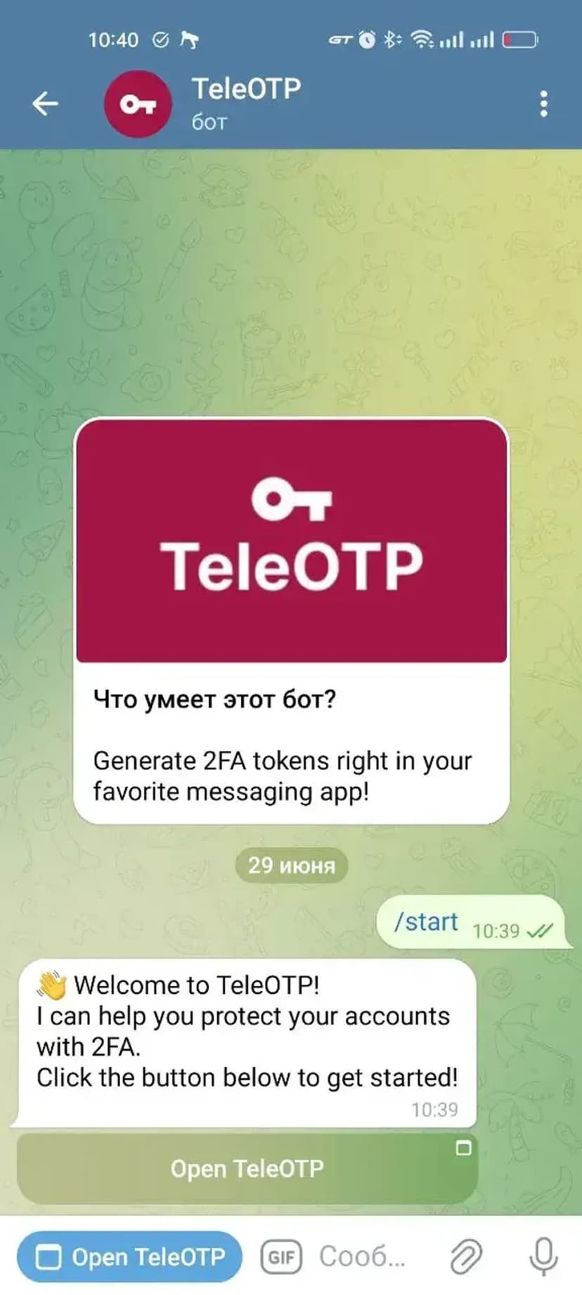 Быстрая генерация одноразовых 2FA-кодов (OTP) прямо в мессенджере