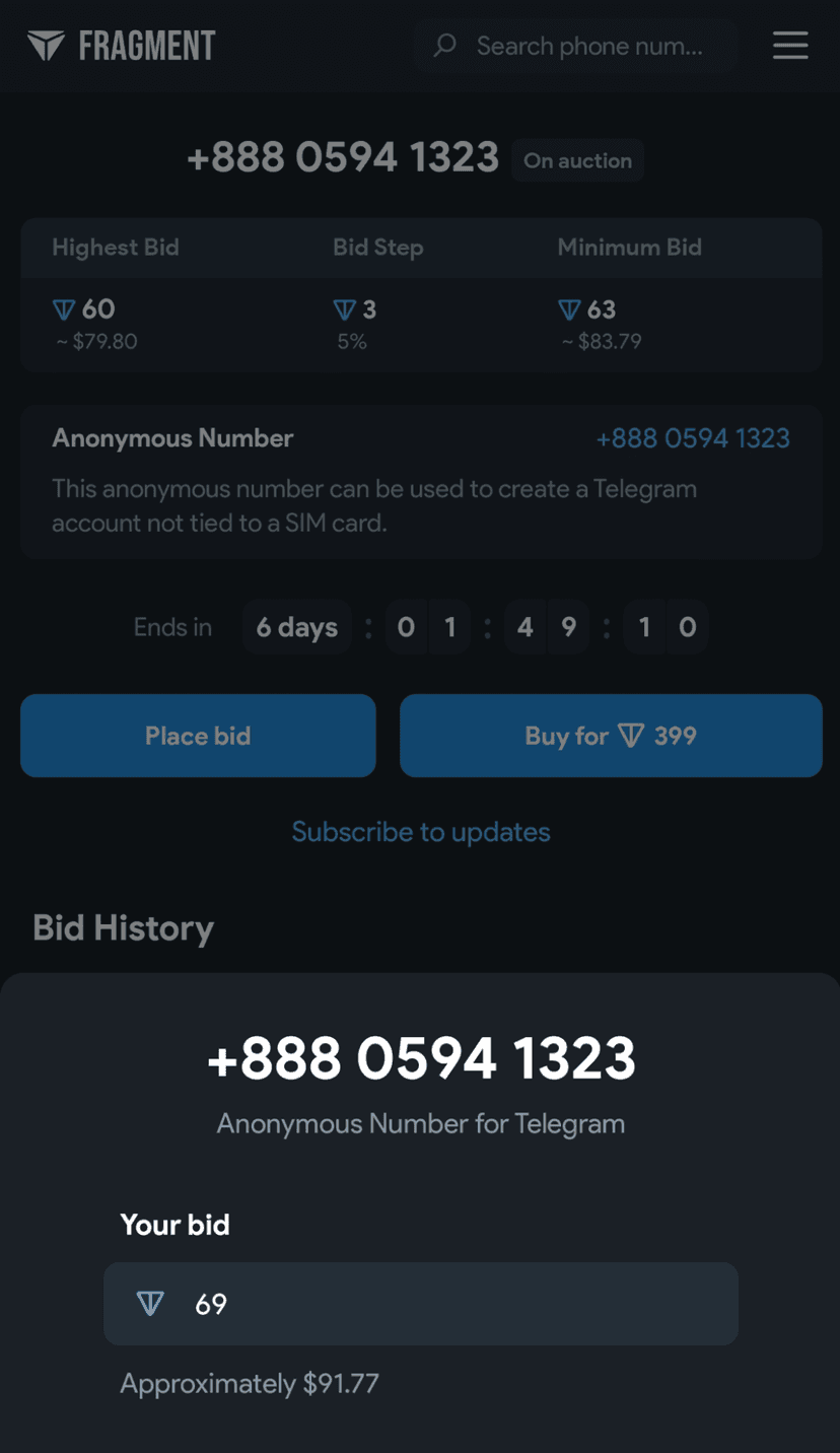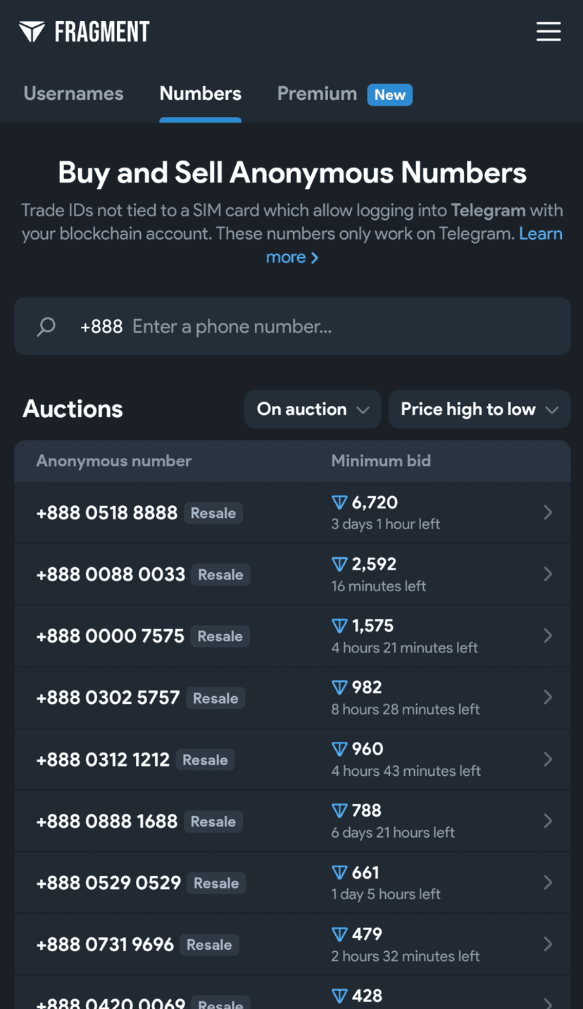 Telegram Numbers предлагает покупку и управление уникальными номерами, не связанными с SIM-картой, предназначенными исключительно для входа в Telegram. Номера полностью интегрированы с блокчейном, что обеспечивает анонимность и независимость от мобильных операторов.