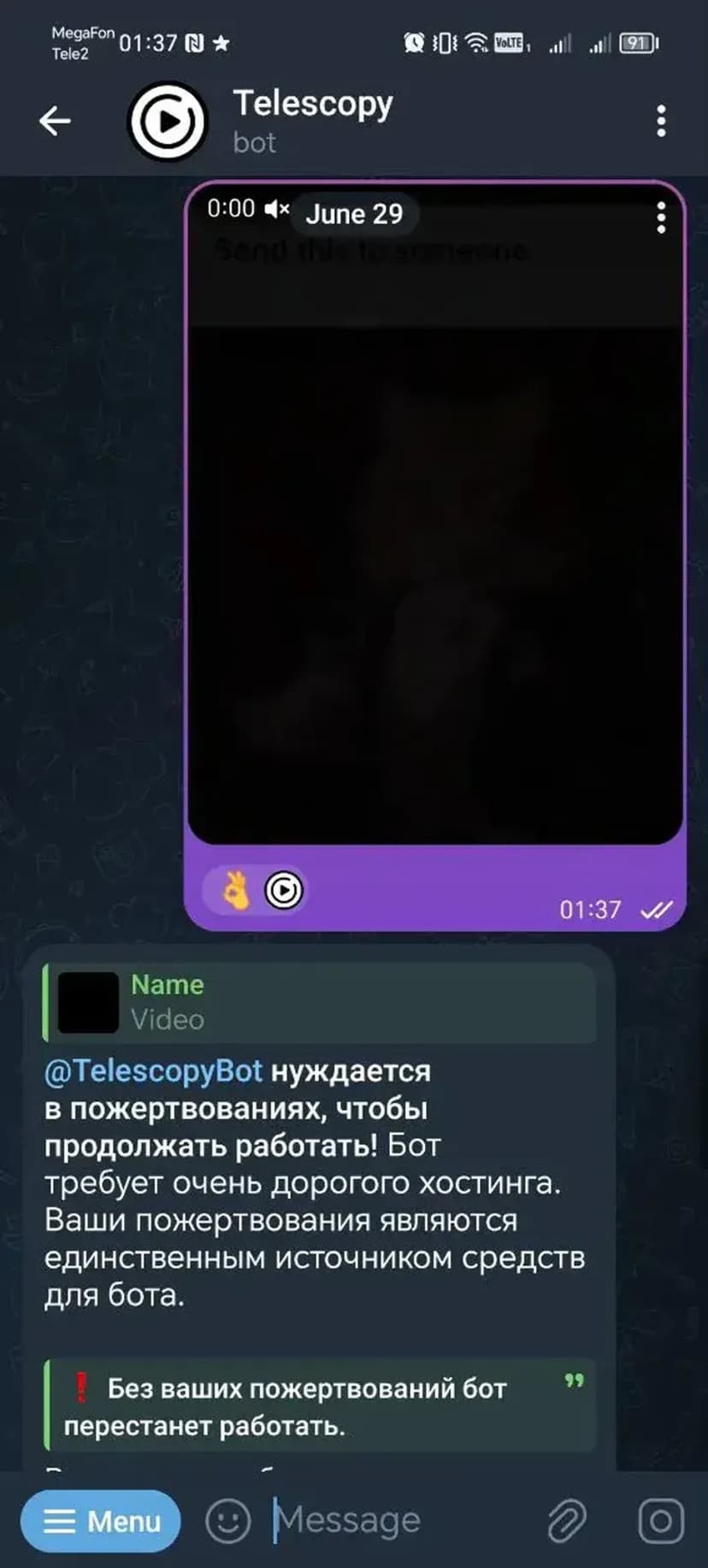 Telescopy превращает обычные видеоролики в круглые видеосообщения: отправьте видео боту и получите готовый округлый клип, удобный для отправки в чатах или публикации в каналах.