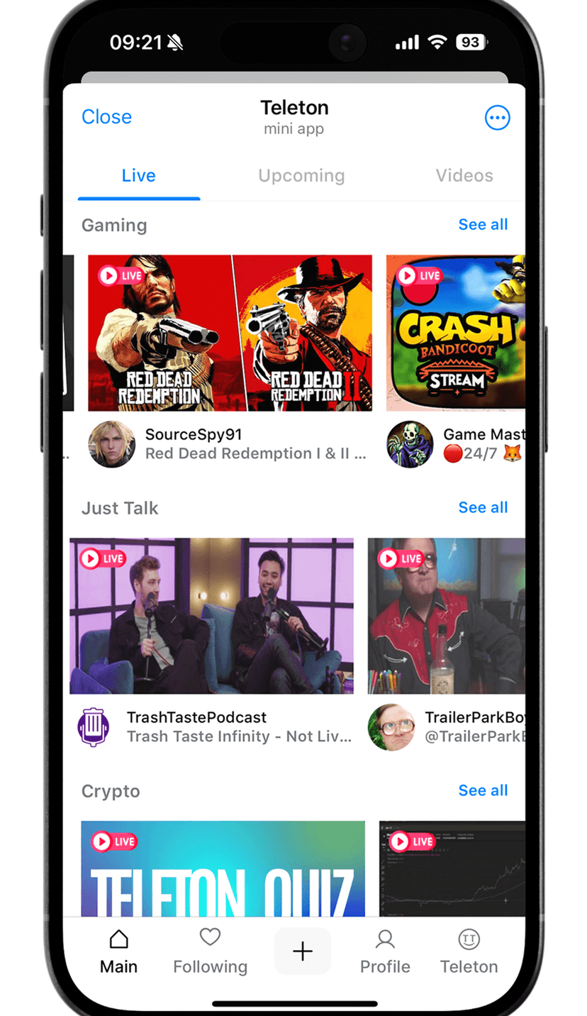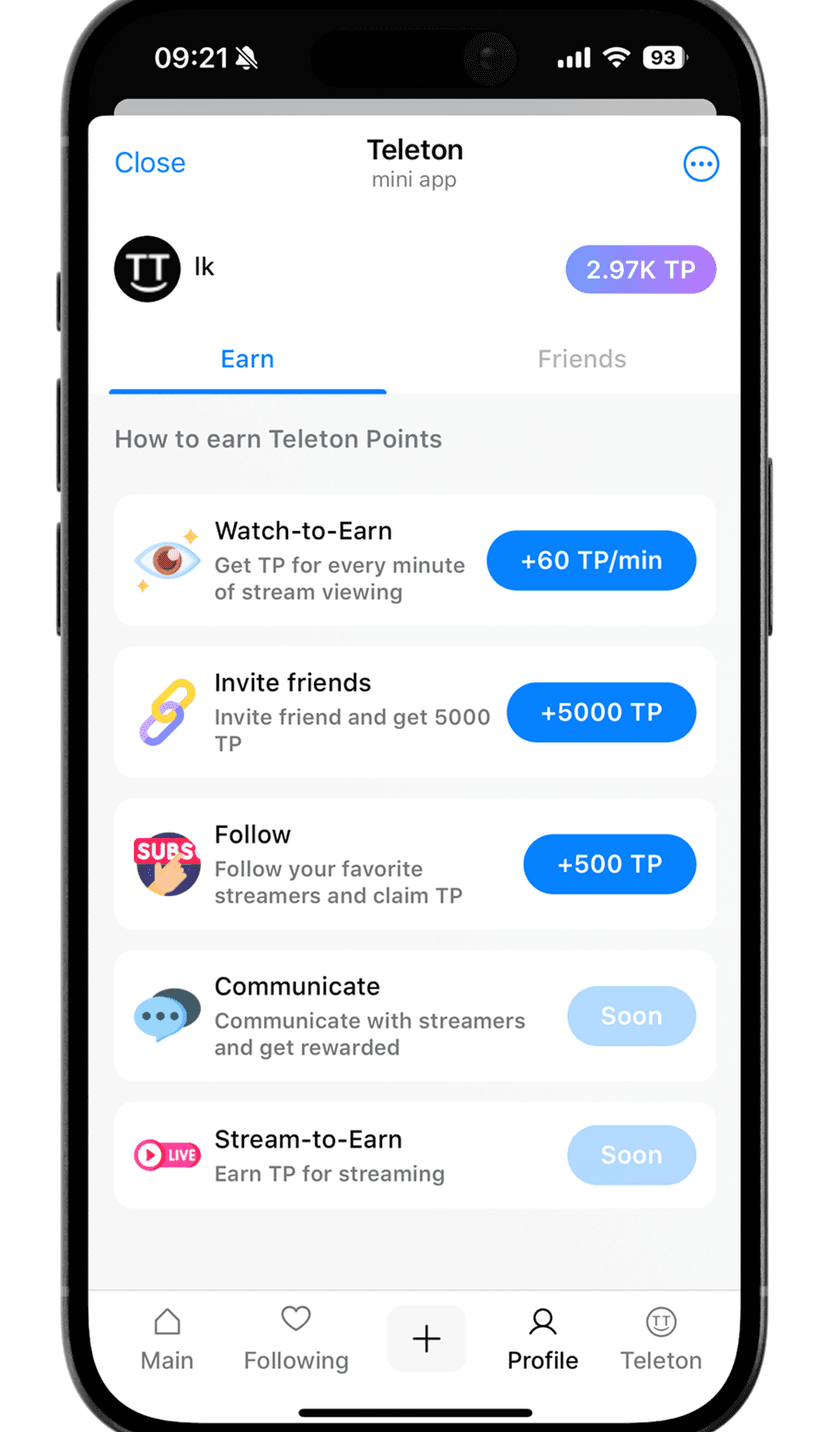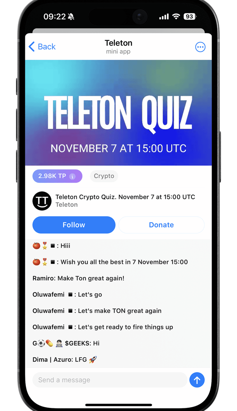Teleton — сервис для проведения и просмотра прямых трансляций внутри Telegram. Пользователи могут смотреть эфиры, вести собственные шоу или участвовать в интерактивных челленджах, одновременно накапливая уникальные баллы TP.