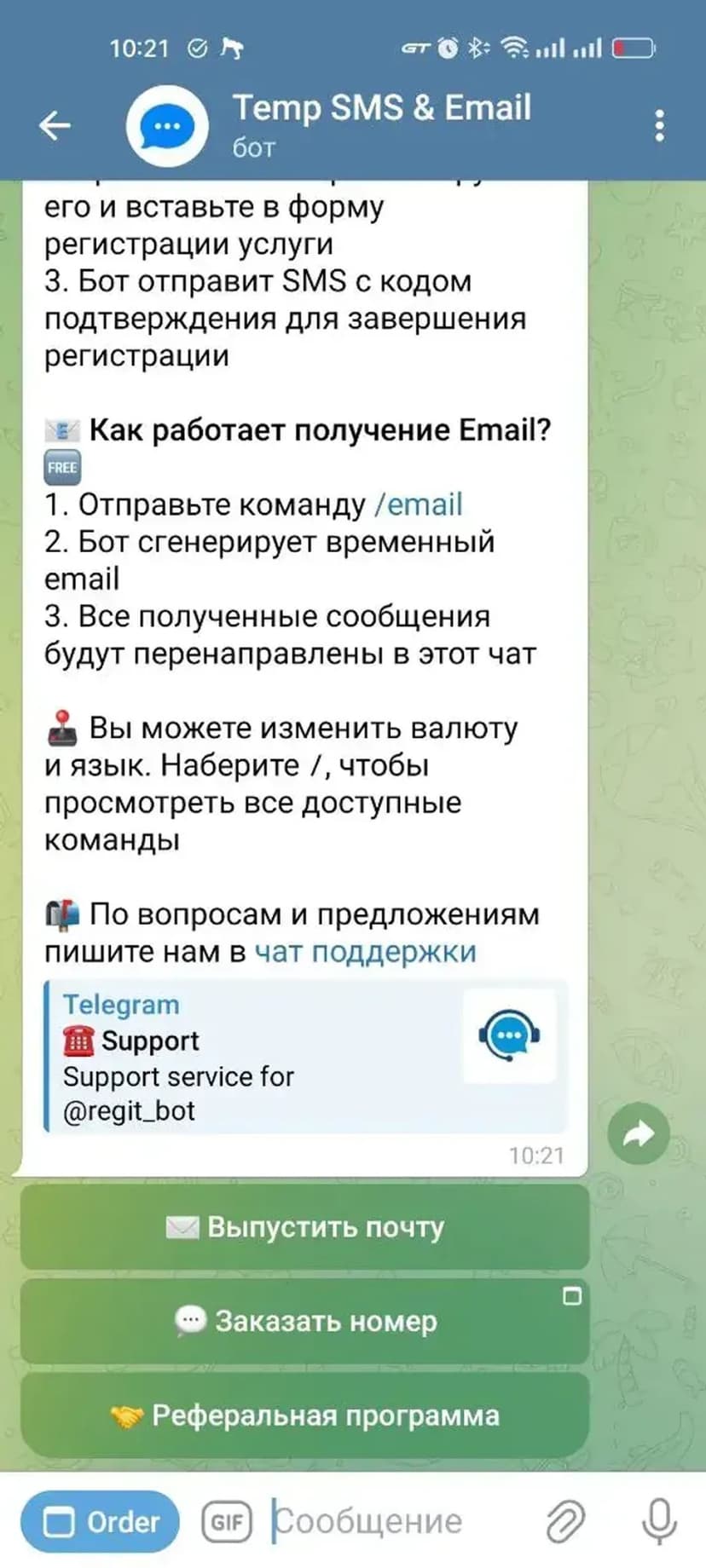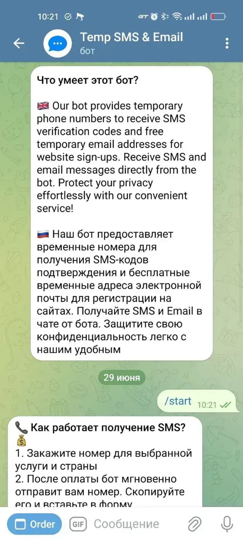 - Временные номера — прием SMS-кодов подтверждения прямо в чате.