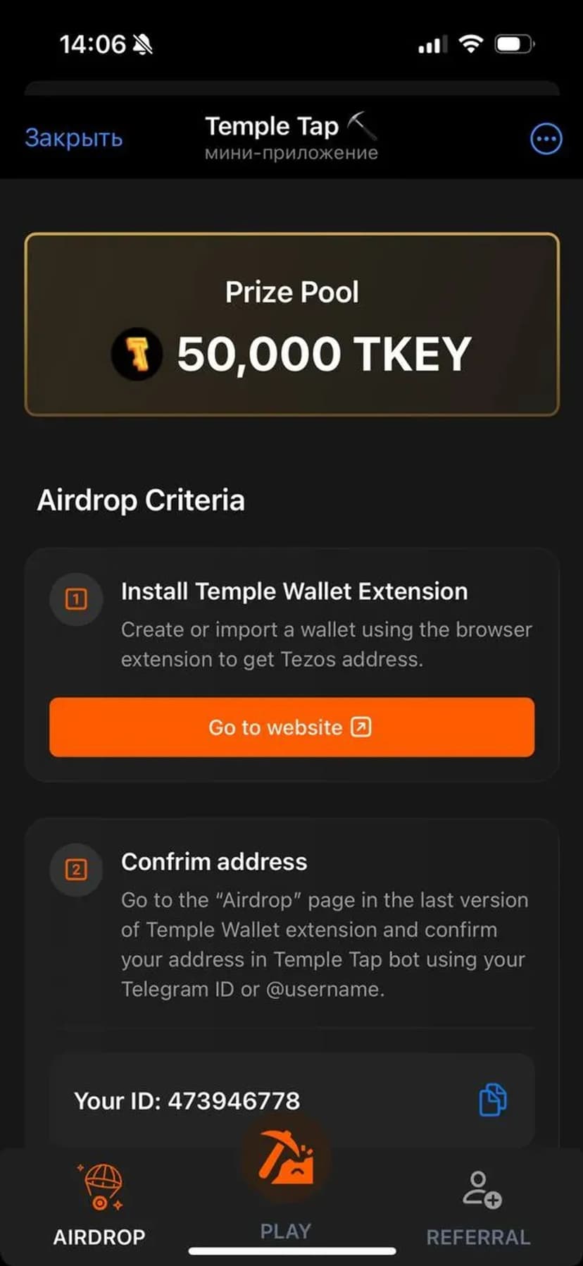 В приложении реализована система приглашений — за привлечение друзей игрок получает дополнительные награды. При желании можно подключить Temple Wallet (Web3) для получения бонусов в виде токенов $TKEY, при этом игровой процесс остаётся независимым от финансовых операций.