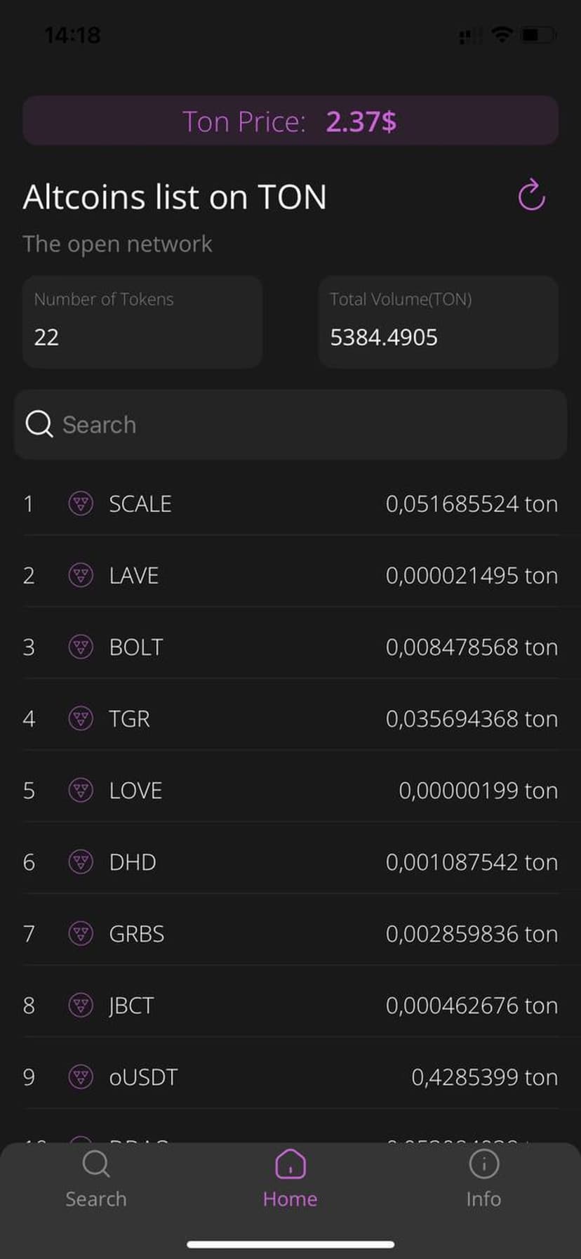 Tenere Explorer предоставляет мгновенный доступ к данным сети TON: актуальные курсы популярных токенов, торговые объёмы, рыночная капитализация и сводная информация о динамике рынка — всё прямо в Telegram без необходимости установки дополнительных сервисов.