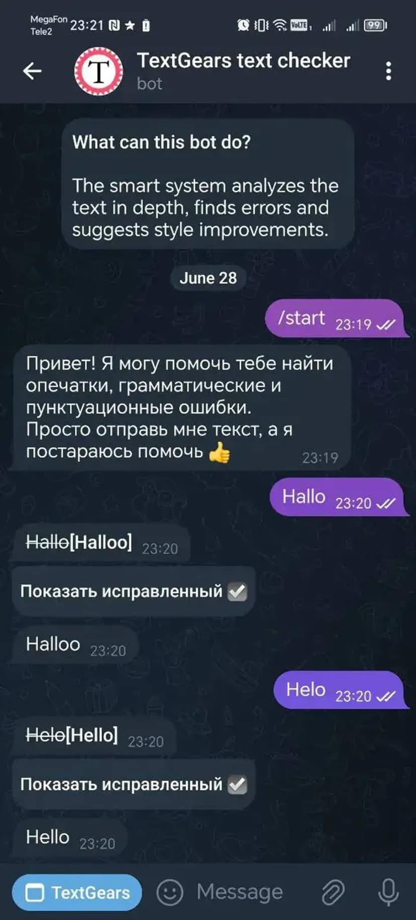 Достаточно отправить сообщение или вставить фрагмент в чат с ботом — проверка выполняется моментально: ошибки подсвечиваются, рядом появляются варианты исправлений. Решение работает непосредственно в Telegram, не требует установки отдельного приложения и поддерживает несколько языков.