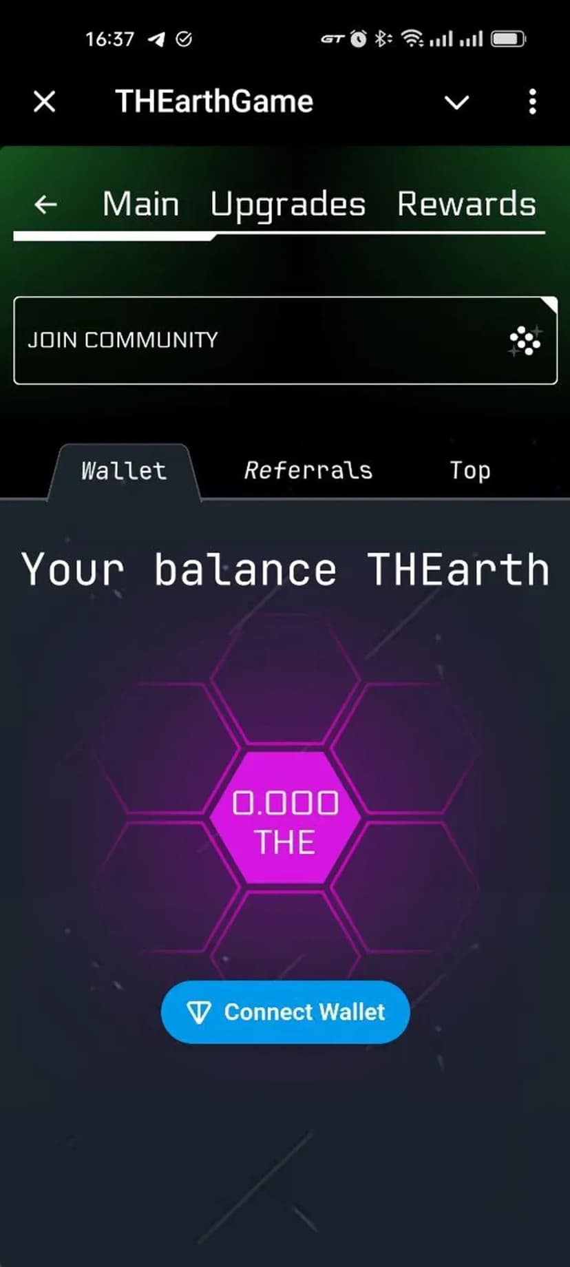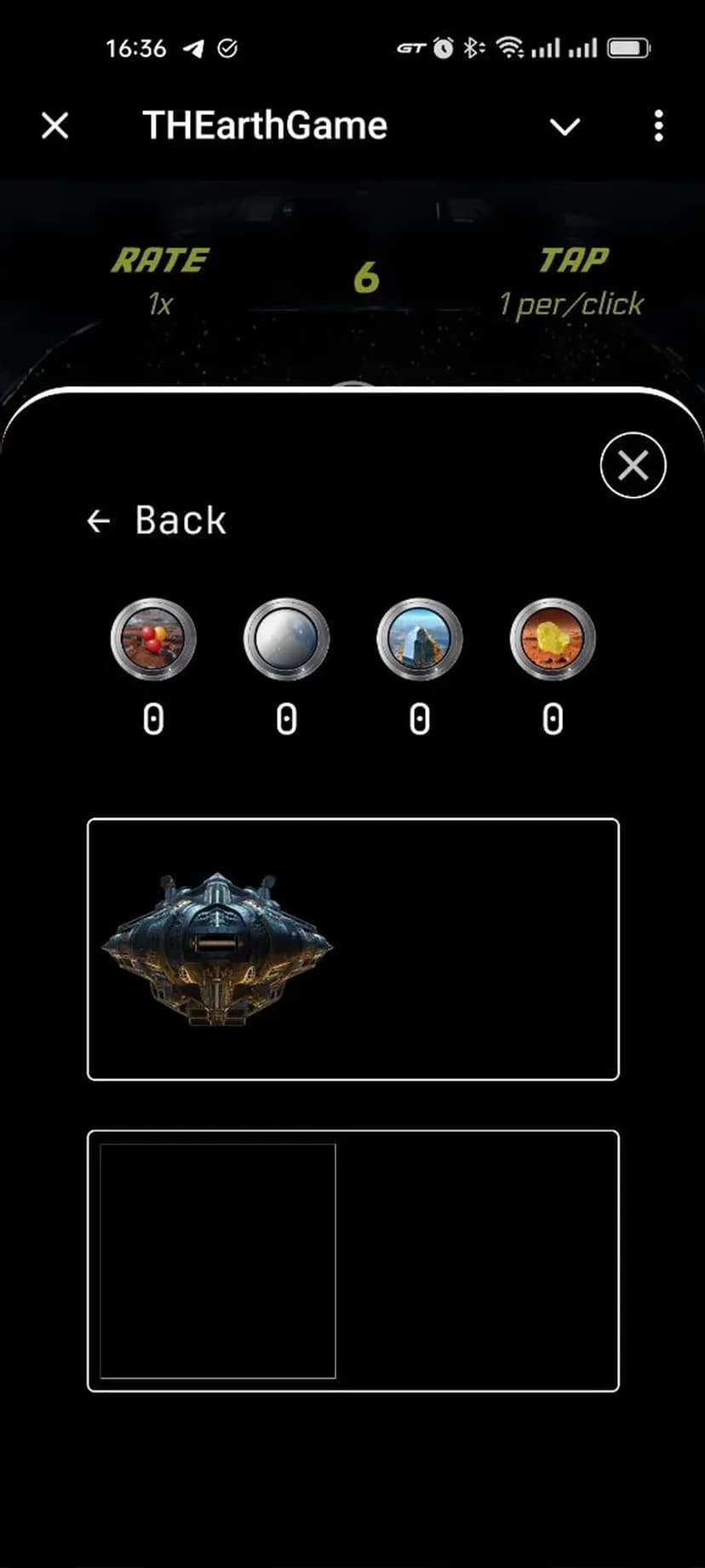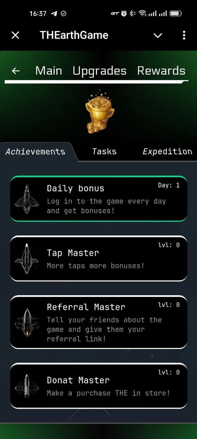 THEarthGame — космический кликер, где вы управляете кораблём, выполняете миссии и получаете внутриигровые награды. Главный экран показывает изображение корабля, индикаторы прогресса, активные задания и кнопки для апгрейда.