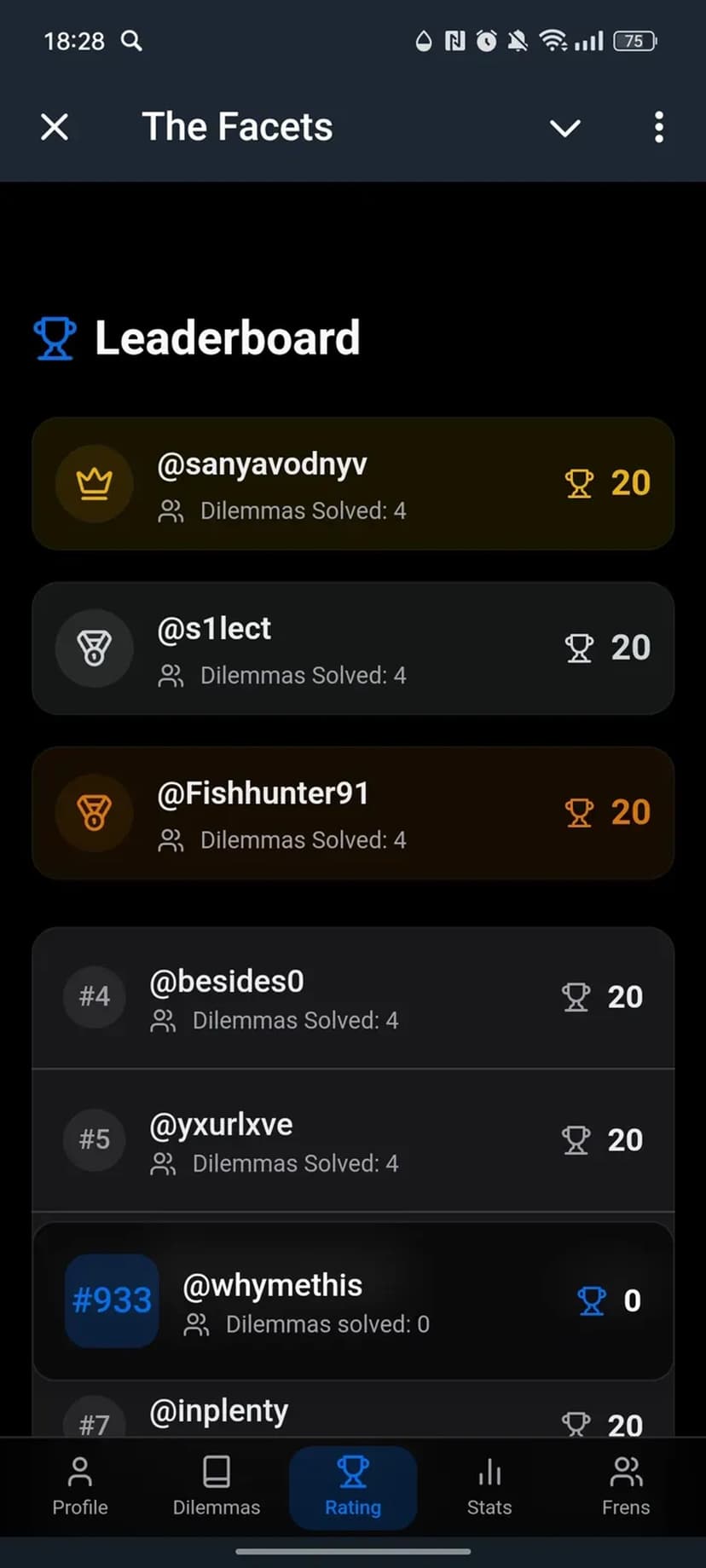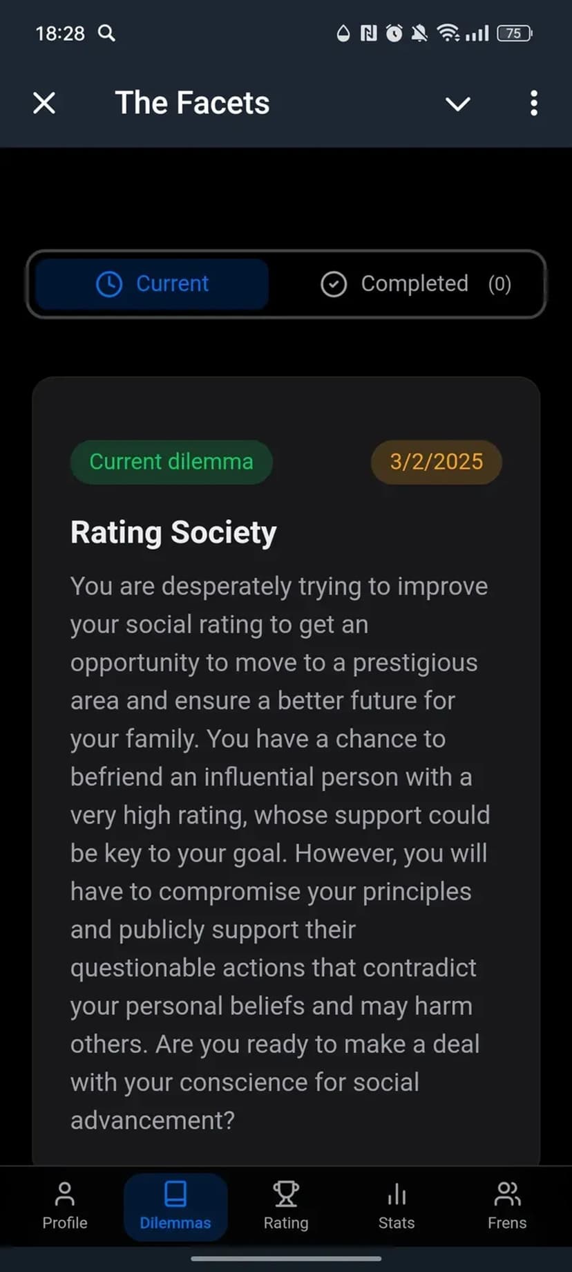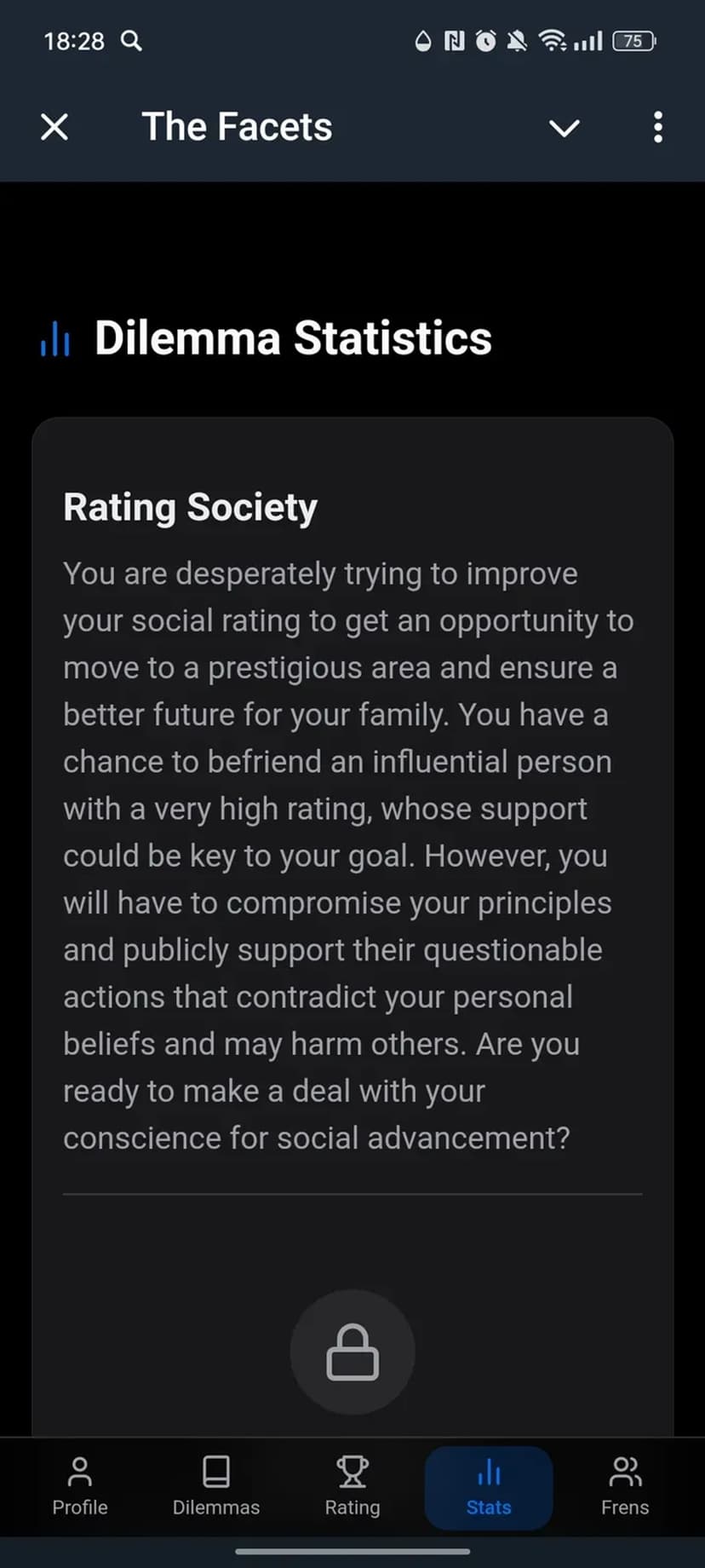 The Facets — интерактивная игра с моральными дилеммами, в которой нет однозначных победителей или проигравших. Каждый раунд предлагает непростую ситуацию и несколько неоднозначных вариантов выбора. После принятия решения вы видите процентное распределение ответов других игроков и можете соотнести свой моральный профиль с коллективным мнением.