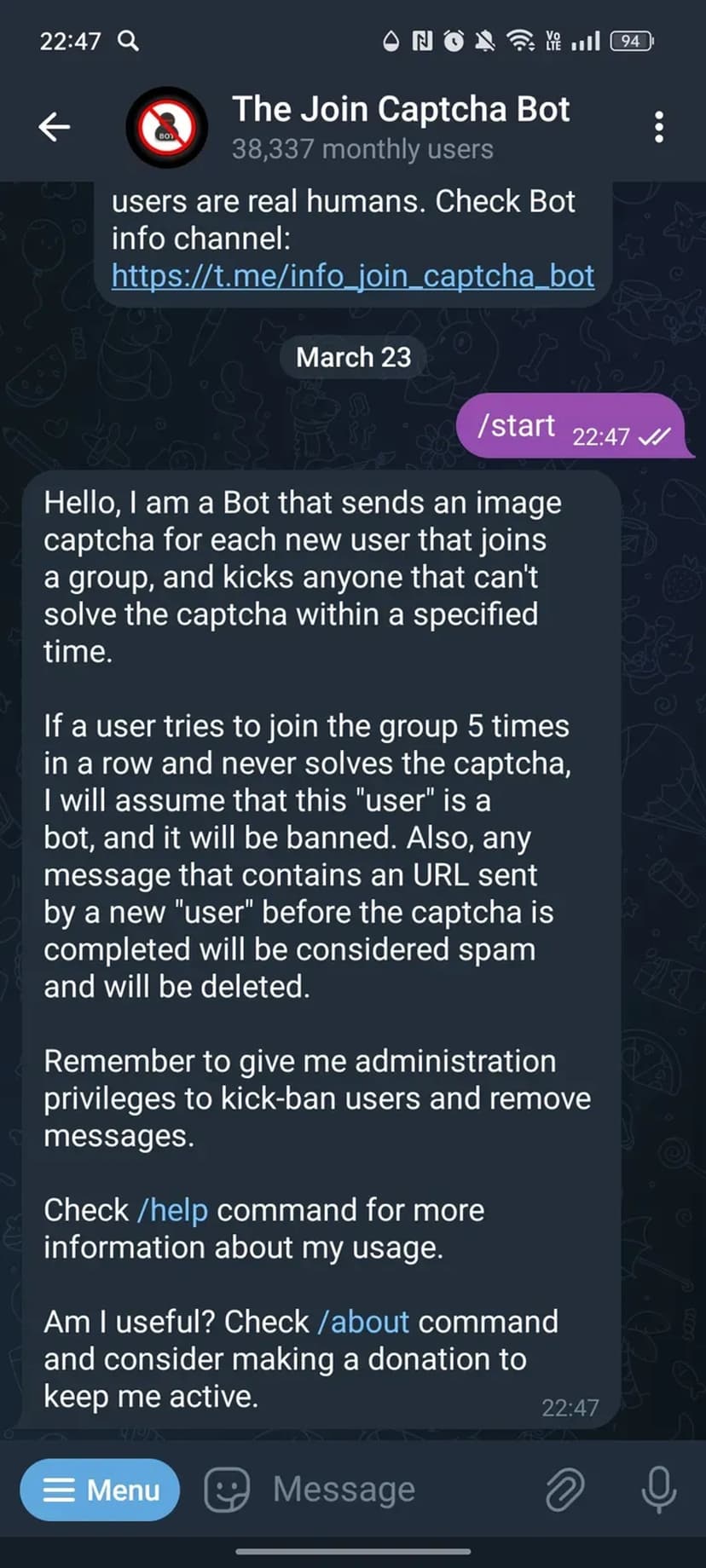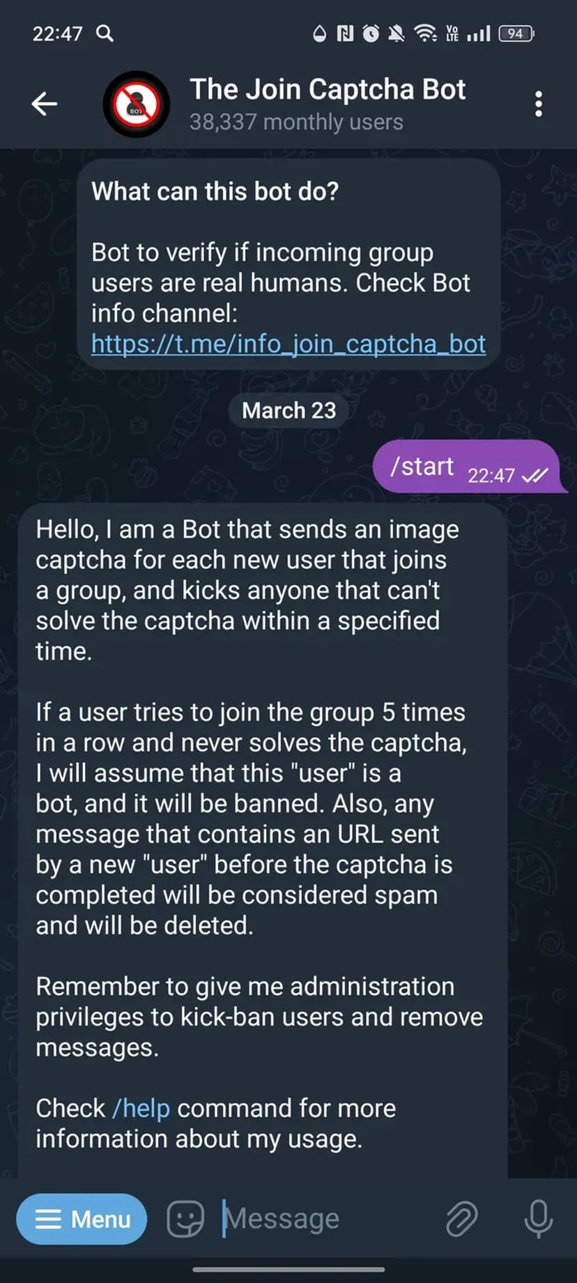 The Join Captcha Bot автоматически проверяет новых участников групповых чатов: каждому вошедшему сразу отправляется графическая капча, и доступ к общению предоставляется только после успешного решения.