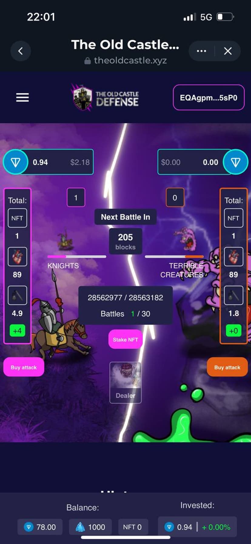 The Old Castle Defense — PvP-осады с механикой play-to-earn и прямой интеграцией NFT. Участники формируют команды и делают ставки своими коллекционными NFT: Terrible Creatures и Knights of the Kingdom. Победители получают вознаграждения в токенах $SPH и $TON, что добавляет экономический стимул к игровым сражениям.