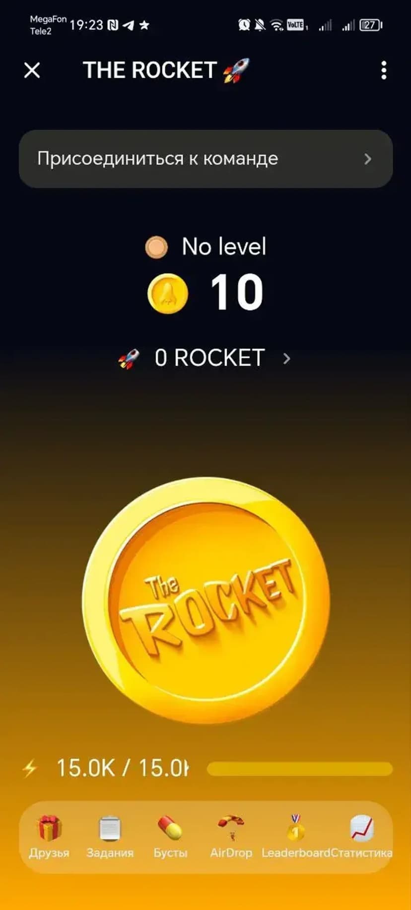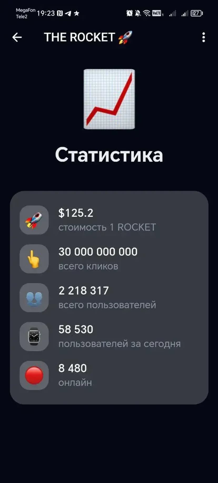 THE ROCKET — простой кликер внутри Telegram-бота. Нажимая, вы зарабатываете внутриигровые монеты, которые можно конвертировать в специальную ракетную валюту и далее обменять на TON. Прогресс и статистика сохраняются в чате, что удобно для игры в короткие сессии.