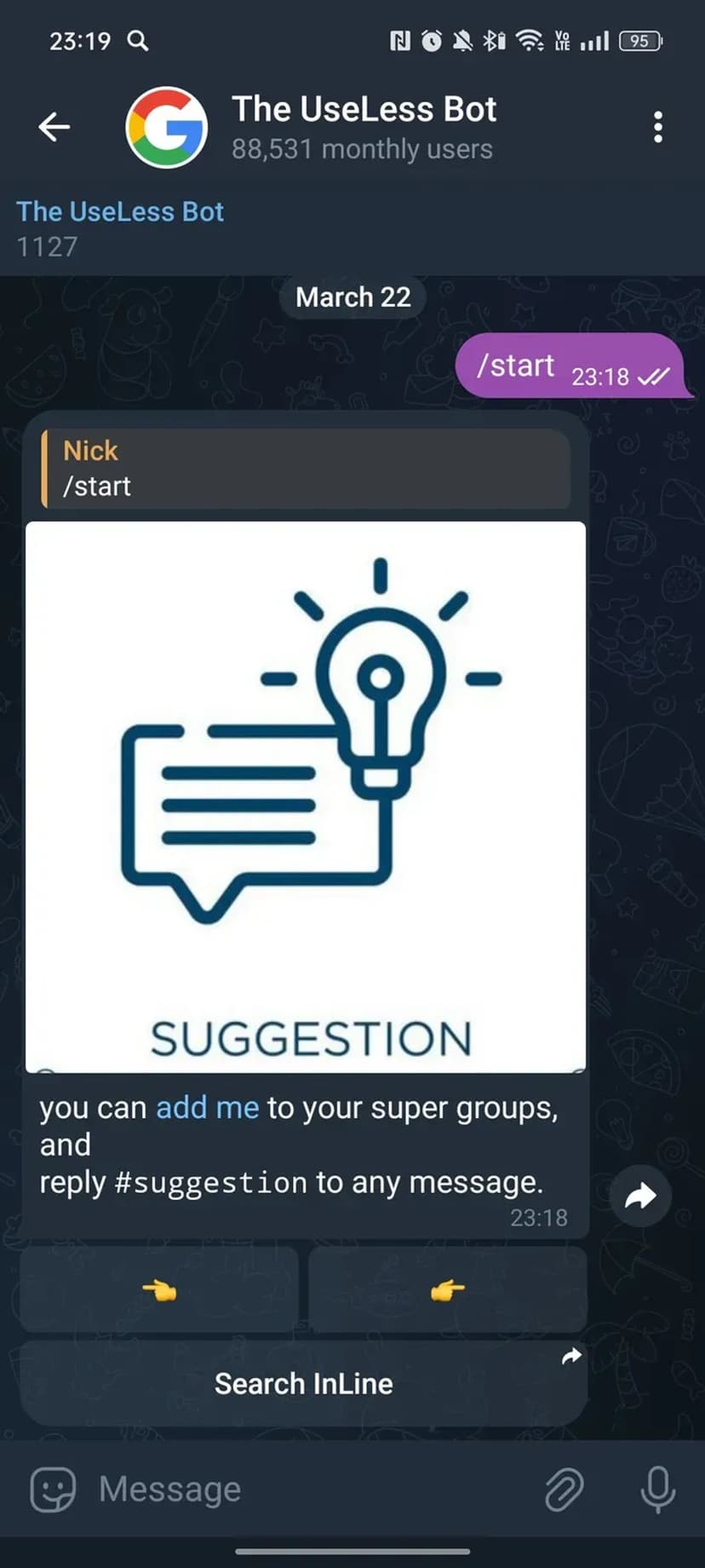 The UseLess Bot собирает анонимные предложения участников супергрупп через тег #suggestion. Сообщение отправляется в ответ на любое сообщение и при этом не раскрывается личность автора.