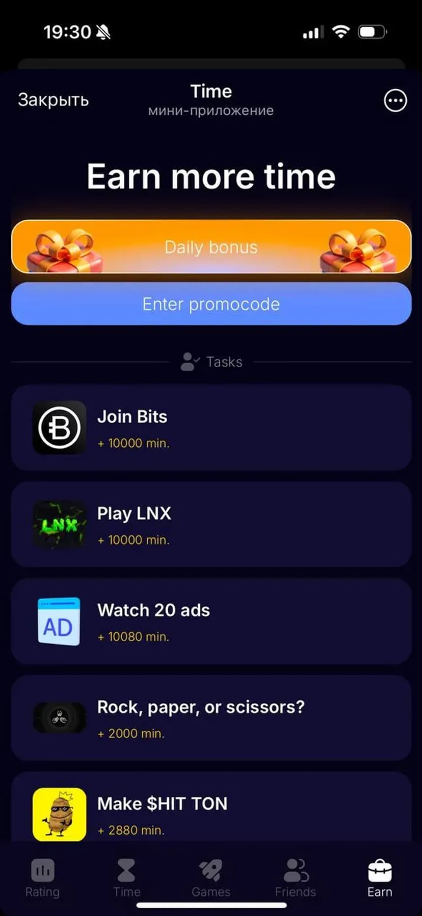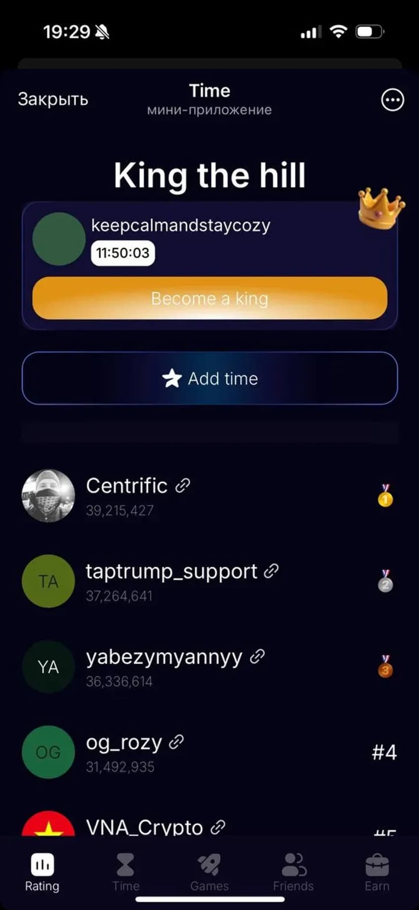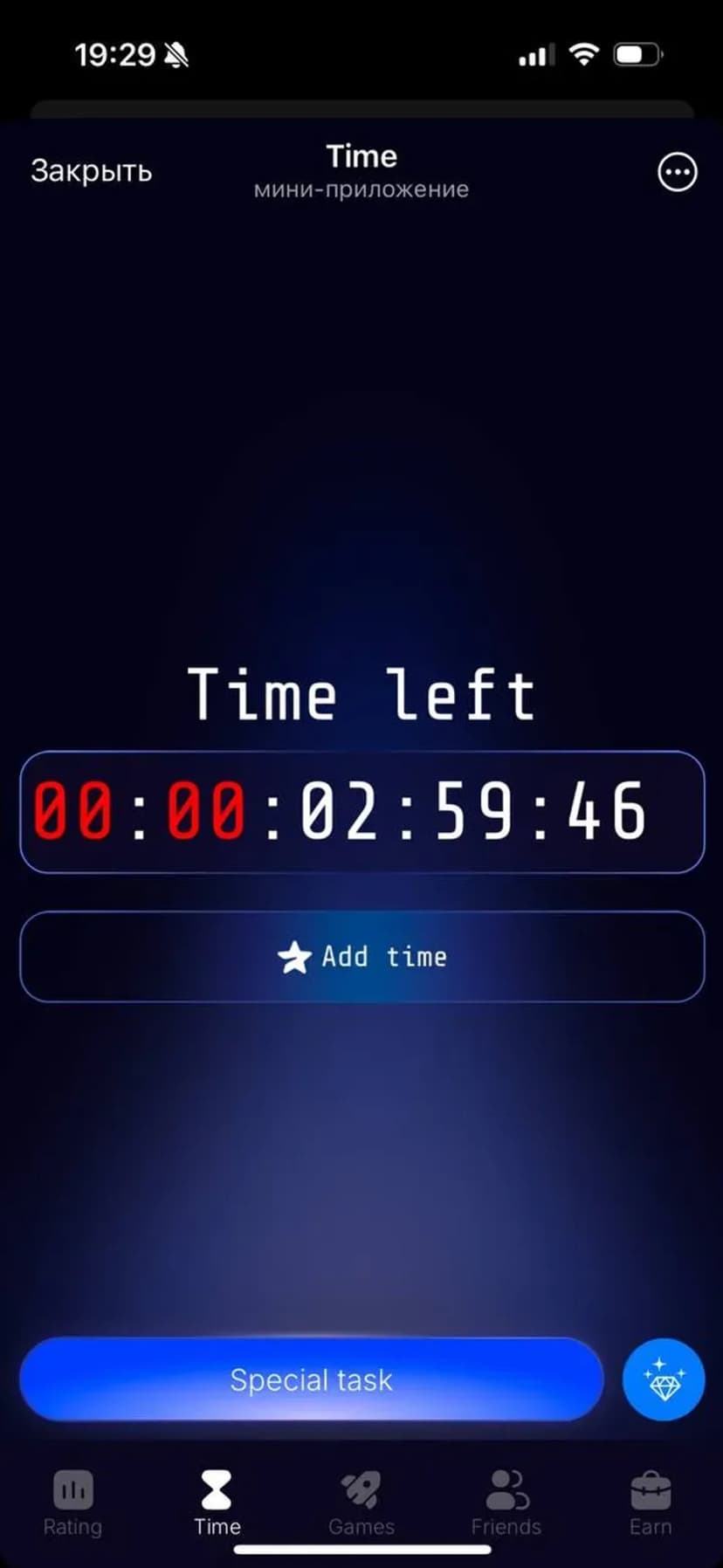 Time — динамичная игра на время внутри Telegram. Пользователь запускает обратный отсчёт и не знает, какие последствия наступят по его окончании, что создаёт интригу и удерживает внимание.