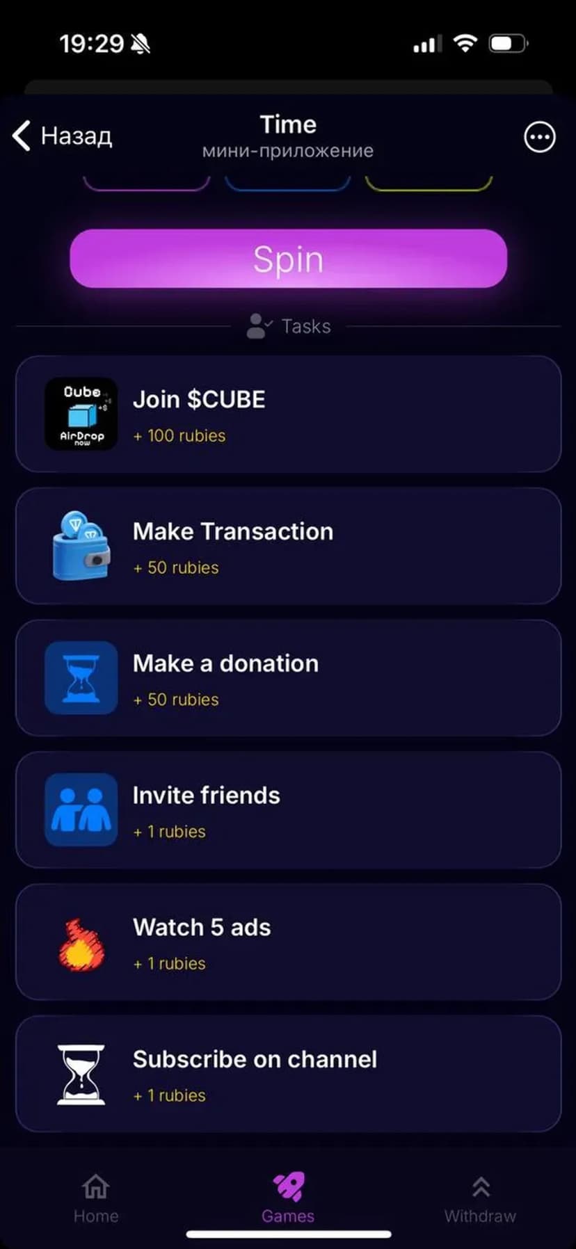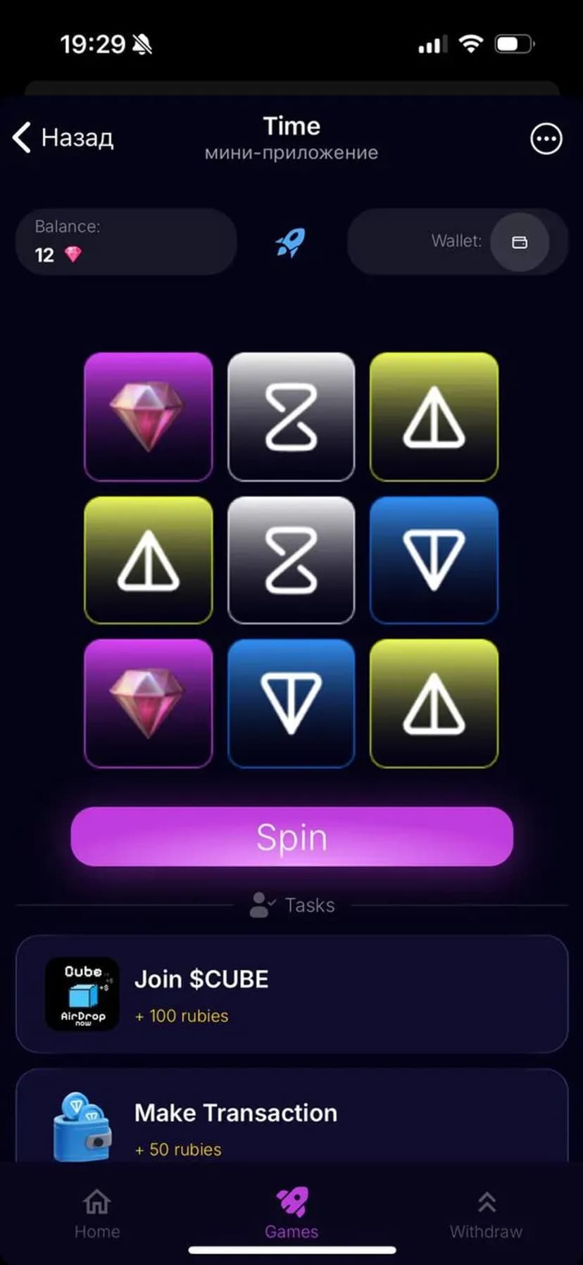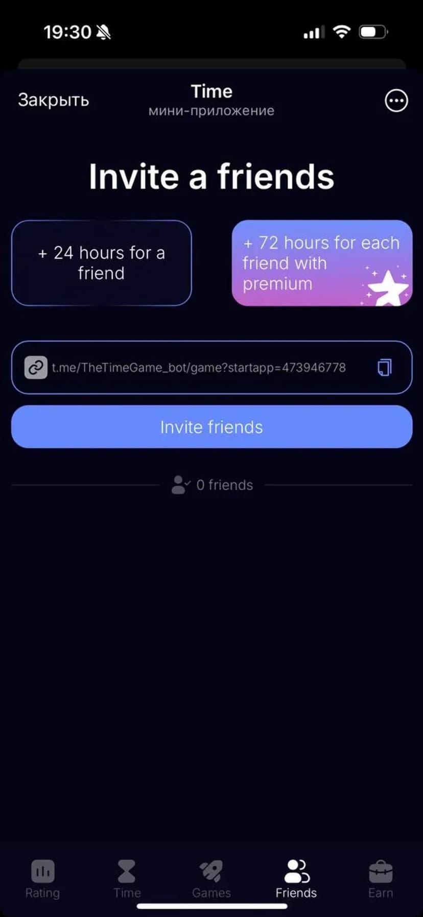 Time — динамичная игра на время внутри Telegram. Пользователь запускает обратный отсчёт и не знает, какие последствия наступят по его окончании, что создаёт интригу и удерживает внимание.