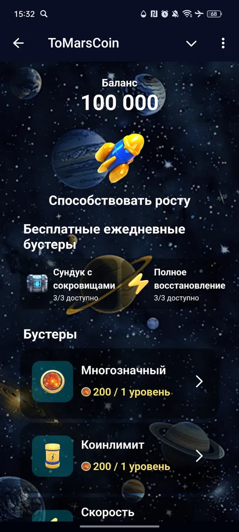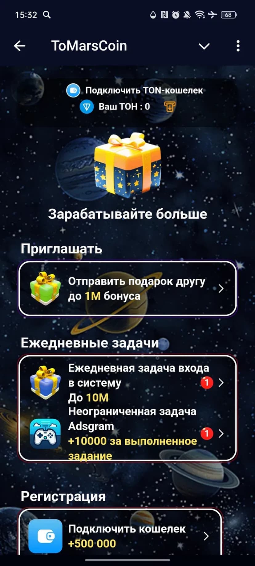 ToMarsCoin — геймифицированный способ получать токены: выполняйте свайпы, контролируйте баланс и повышайте позиции в рейтинге.