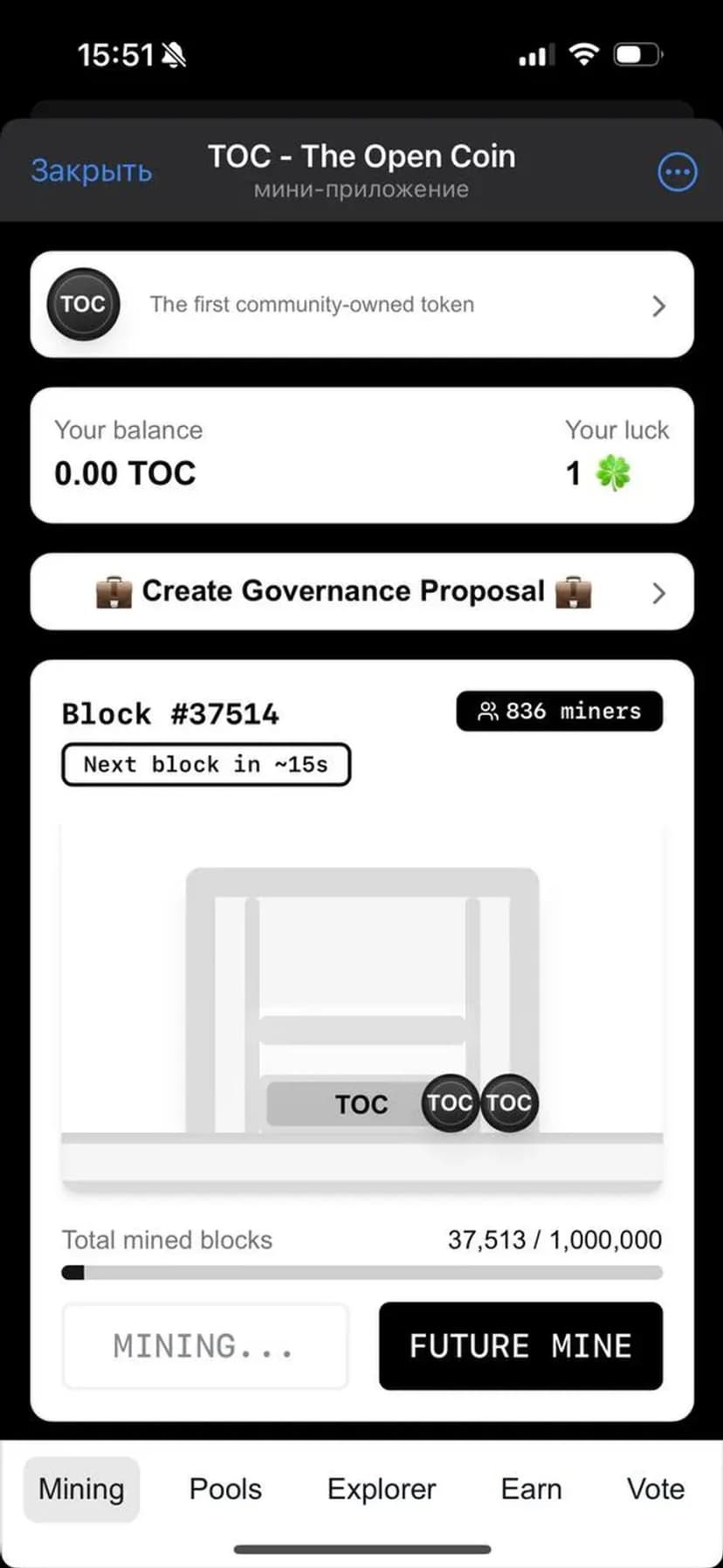 TOC — The Open Coin позволяет получить опыт участия в распределённой токен‑системе, вдохновлённой принципами Bitcoin. Приложение предлагает минималистичный интерфейс с основными элементами на главном экране: запуск майнинга, отображение текущего баланса и информация о халвинге. Важные события приходят в виде уведомлений.