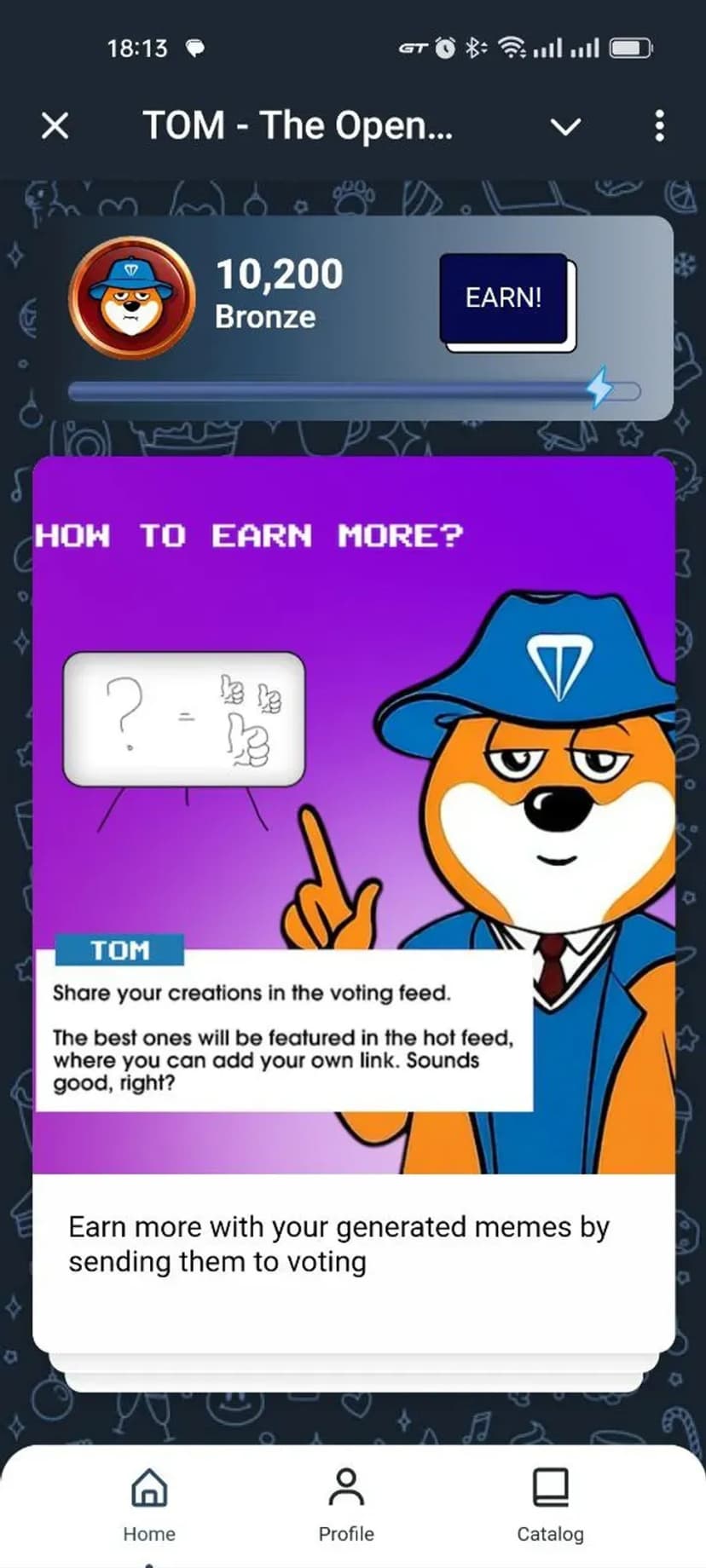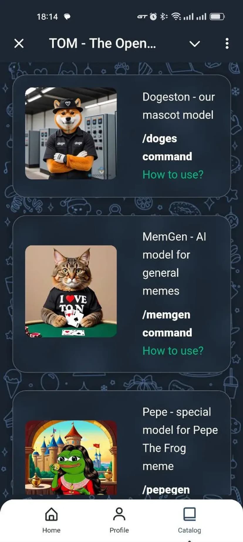 TOM — The Open Meme интегрируется в Telegram и предоставляет удобный инструмент для создания мемов с помощью искусственного интеллекта. При первом запуске открывается понятный интерфейс: выбор шаблонов, генерация изображений по текстовому описанию и мгновенная отправка готовых мемов в чаты.