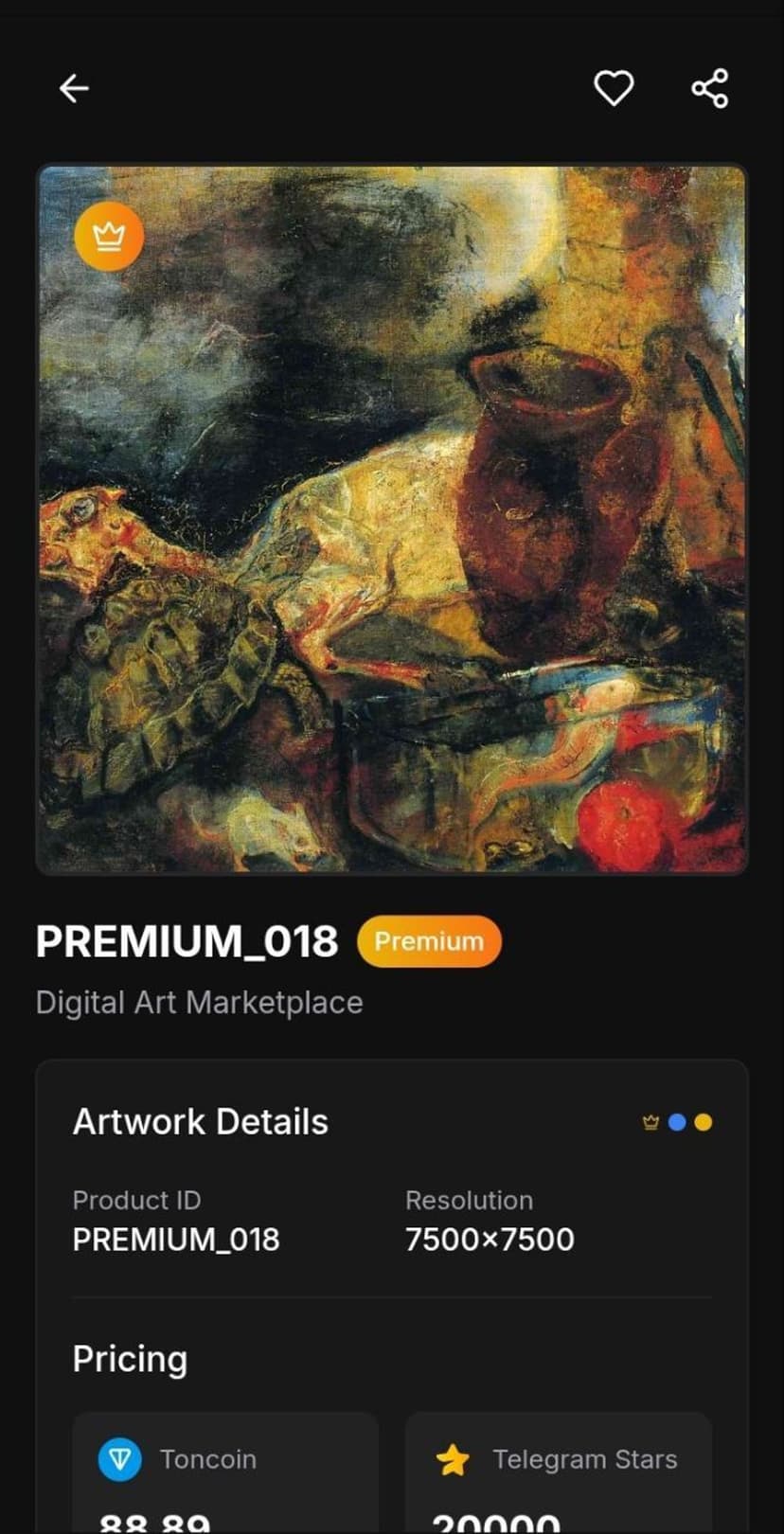 - Покупка: выбор изображения и оплата встроенными платежами TON; после подтверждения объект мгновенно закрепляется за вами.