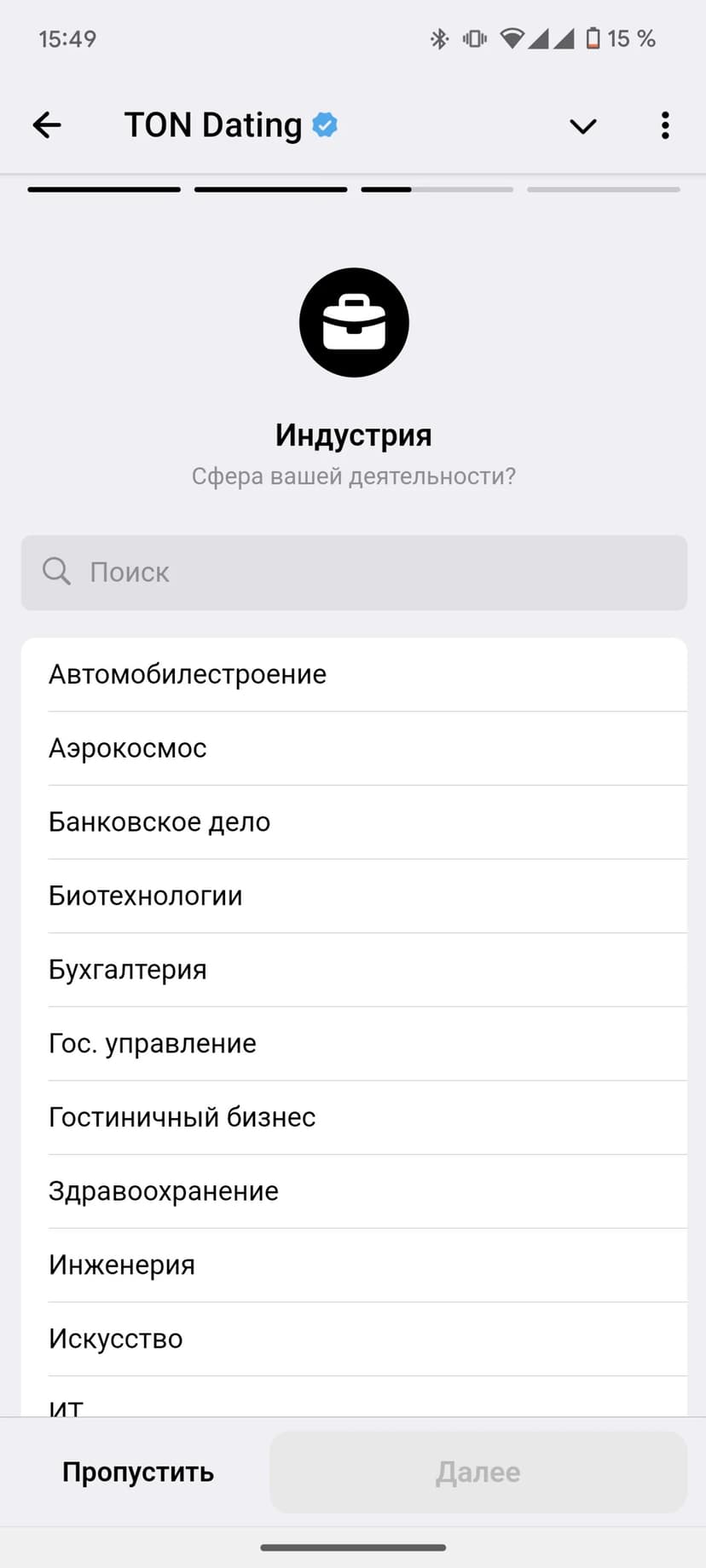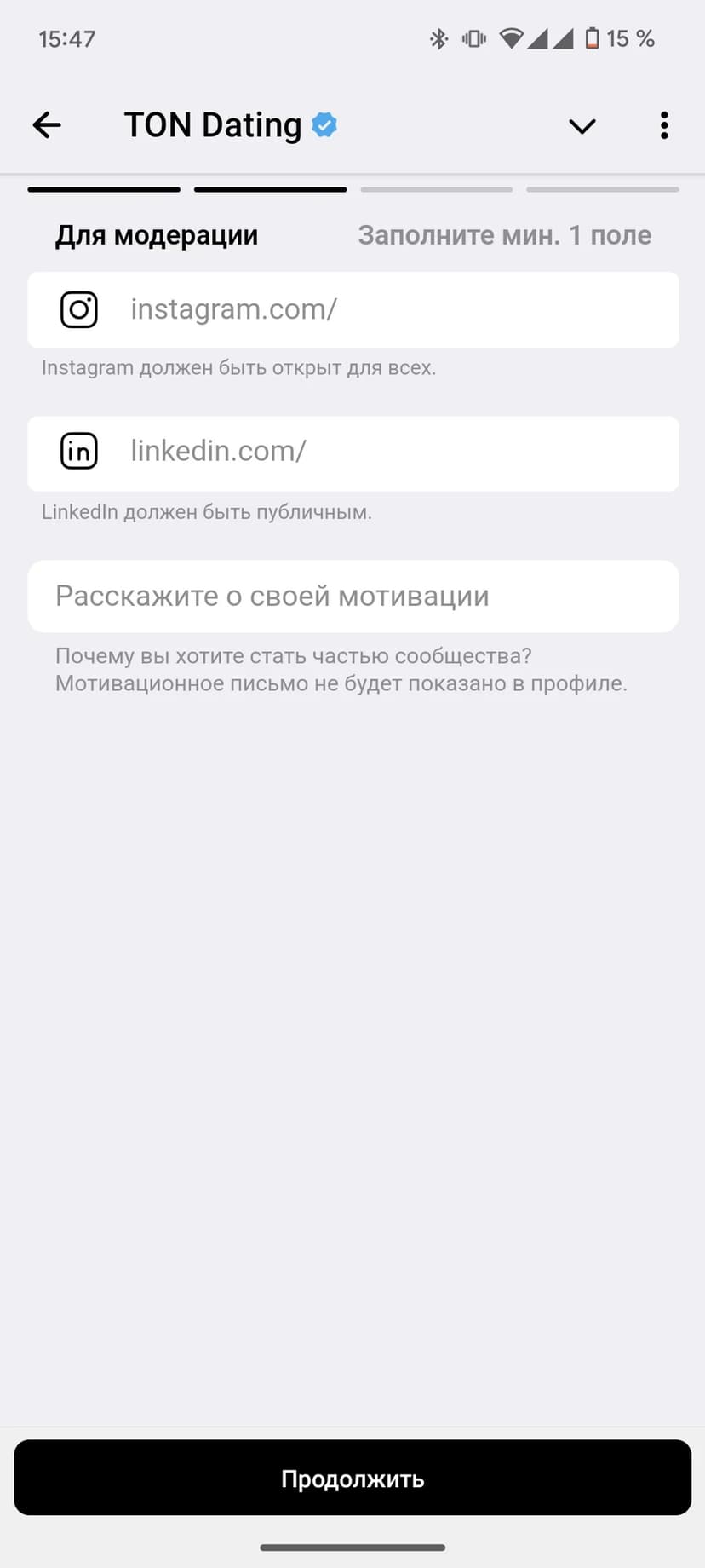 - Верификация профиля: нужно указать имя, описание, дату рождения, город и пол, прикрепить ссылку на публичный Instagram или LinkedIn, рассказать о мотивации участия и загрузить три личных фото. Бот также попросит сделать новое селфи в заданной позе для сверки с указанными профилями.