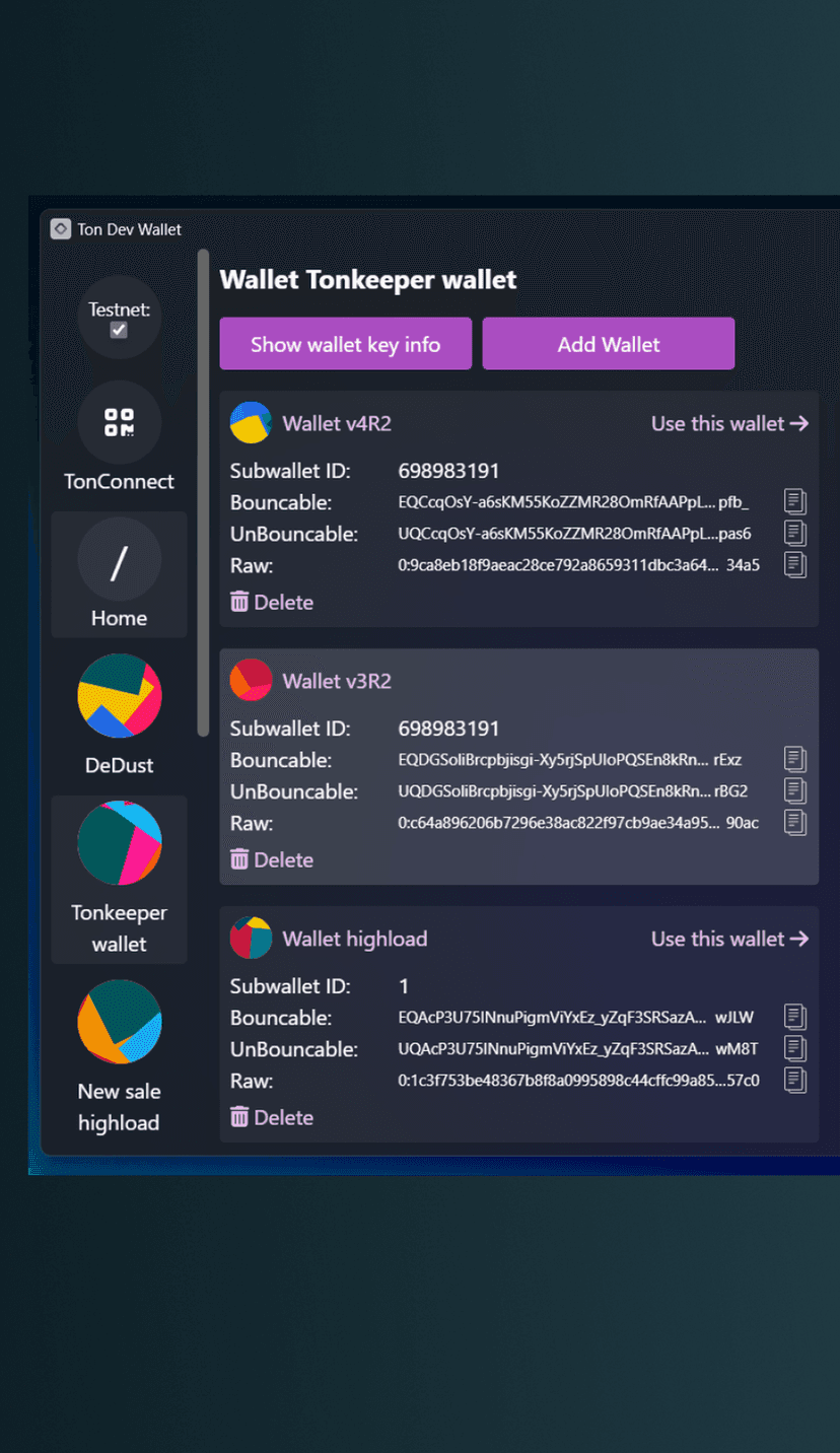 TonDevWallet — инструмент для разработчиков экосистемы TON, позволяющий создавать и настраивать кошельки с индивидуальными идентификаторами и выбирать версии кошельков. Поддерживаются высоконагруженные кошельки на базе TonConnect.