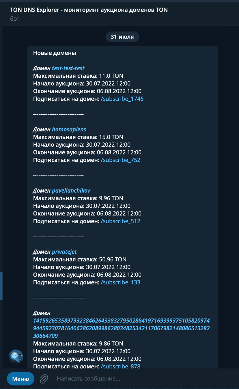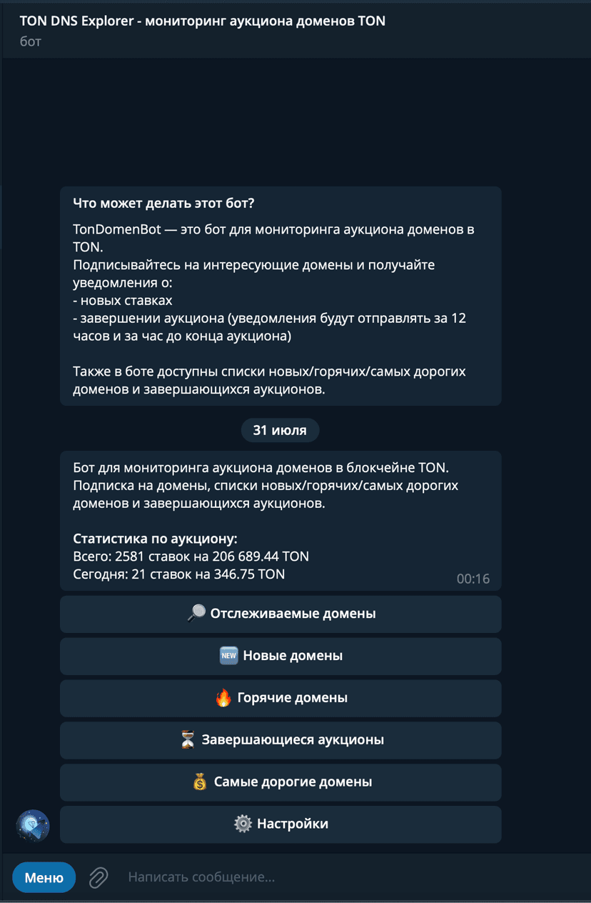 TonDomenBot обеспечивает мониторинг аукционов доменов в сети TON DNS, отправляет оперативные уведомления о новых лотах, показывает динамику ставок и собирает статистику по доменам.