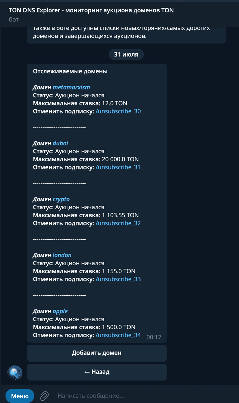 Мониторинг аукционов доменов TON: уведомления, отслеживание ставок и статистика