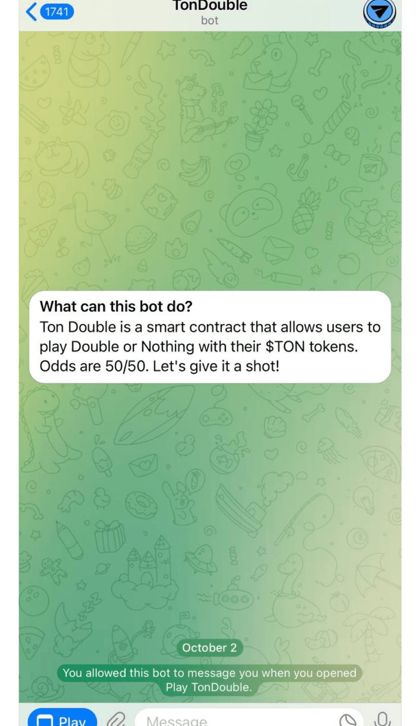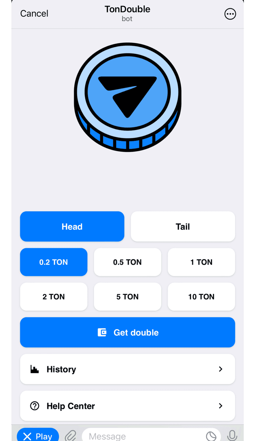 Ton Double — мини‑приложение в Telegram на базе смарт‑контракта в сети TON, дающее возможность сыграть в формат Double or Nothing с токенами $TON. Пользователь делает ставку и запускает «подброс монеты»: исход — либо удвоение ставки, либо полная потеря залога. Решение о выигрыше формируется смарт‑контрактом и фиксируется в блокчейне.