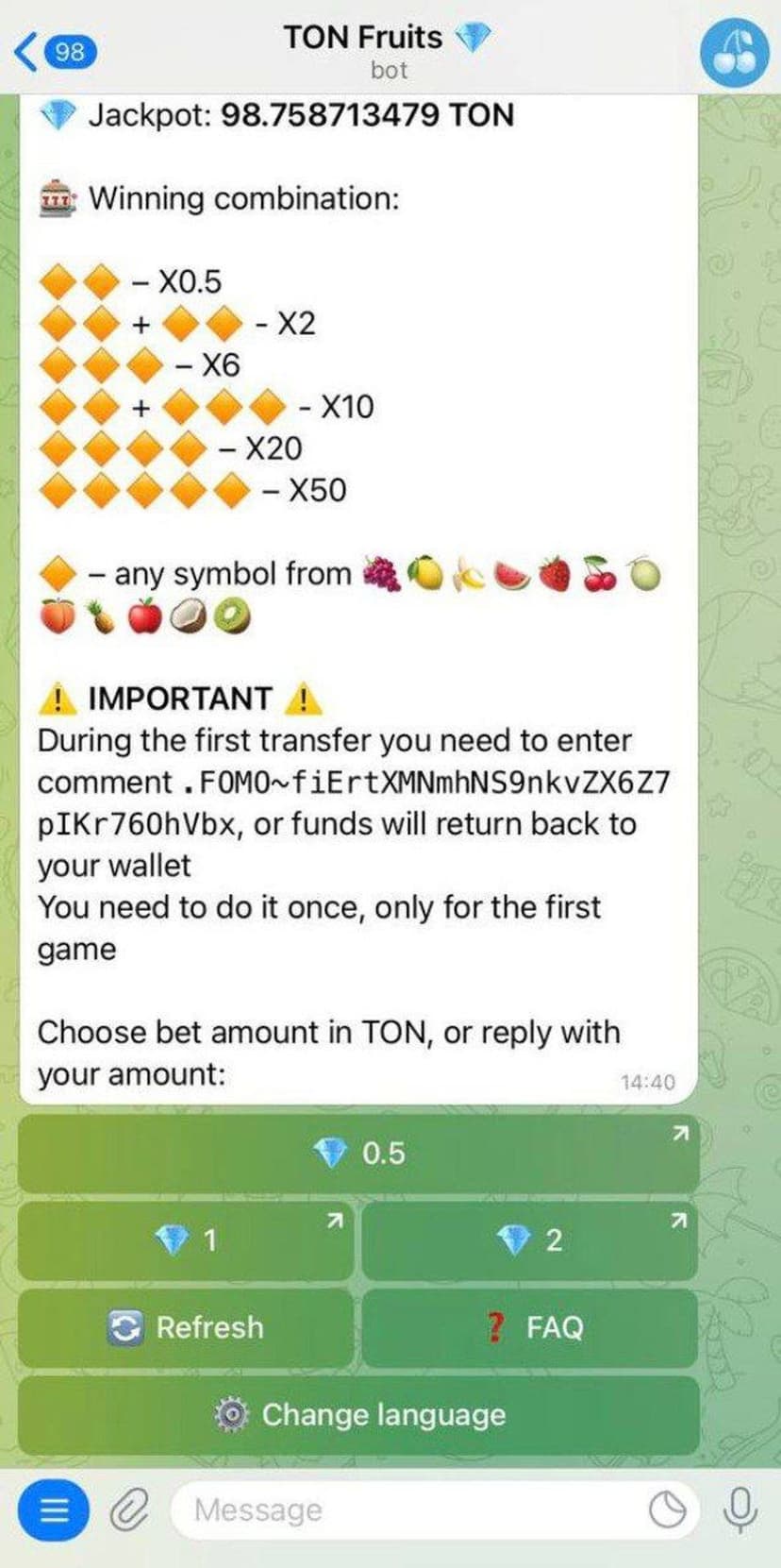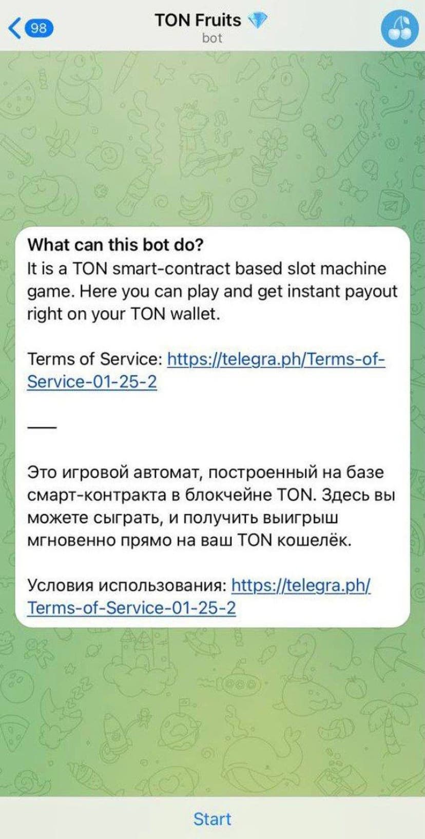 *Нажимая "Открыть в Telegram", вы перейдете к приложению TON Fruits в мессенджере Telegram