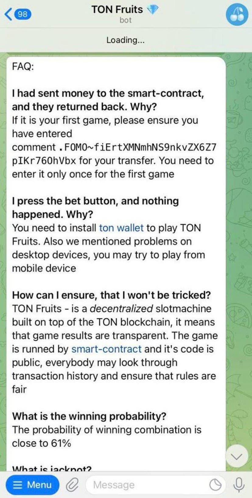 TON Fruits — слот‑игра, реализованная на смарт‑контрактах TON. Все ходы, ставки и результаты сохраняются в блокчейне, что обеспечивает проверяемую и неизменяемую логику игры. Исходный код открыт для аудитa, повышая прозрачность процессов.