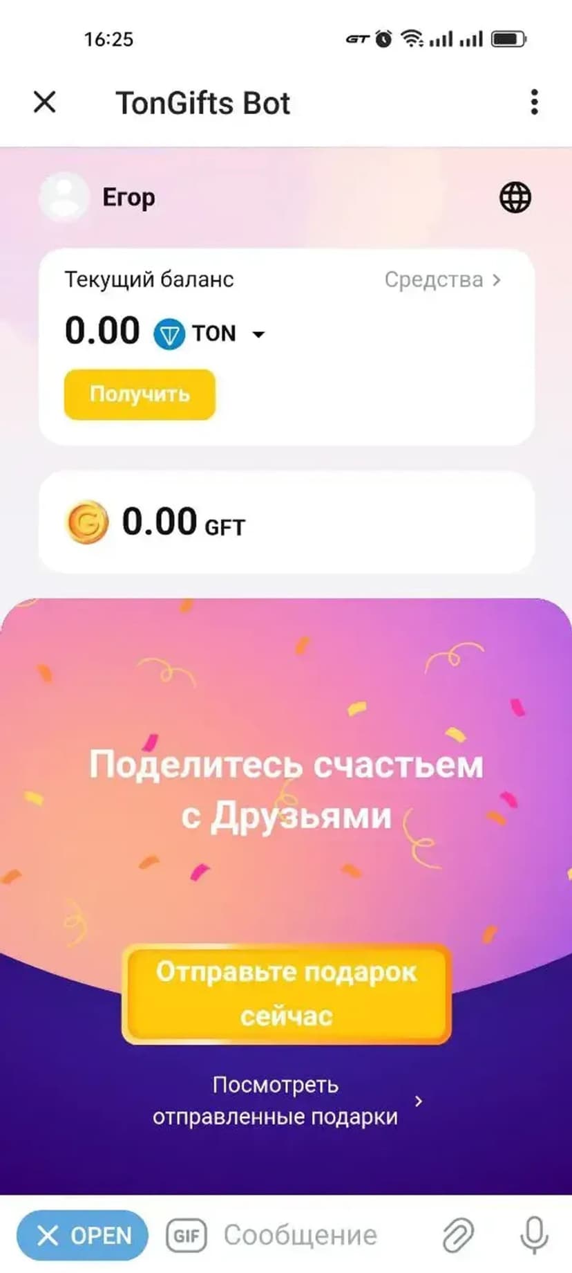*Нажимая "Открыть в Telegram", вы перейдете к приложению TonGifts Bot в мессенджере Telegram