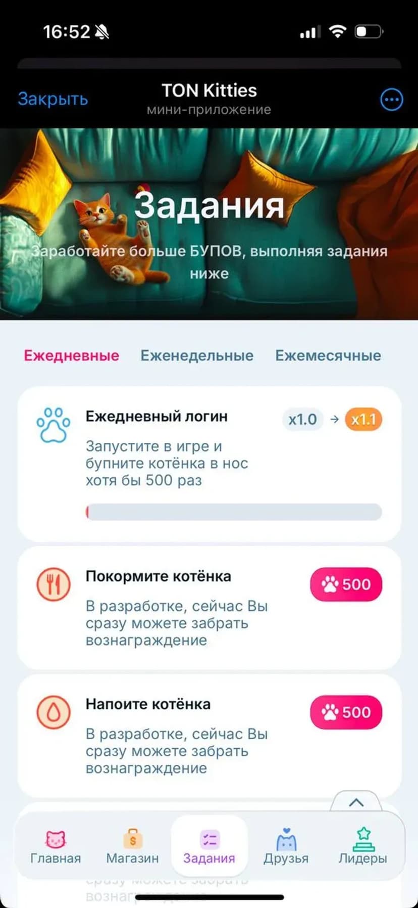 - Апгрейды и кастомизация: аксессуары, игрушки и прочие улучшения для котёнка.