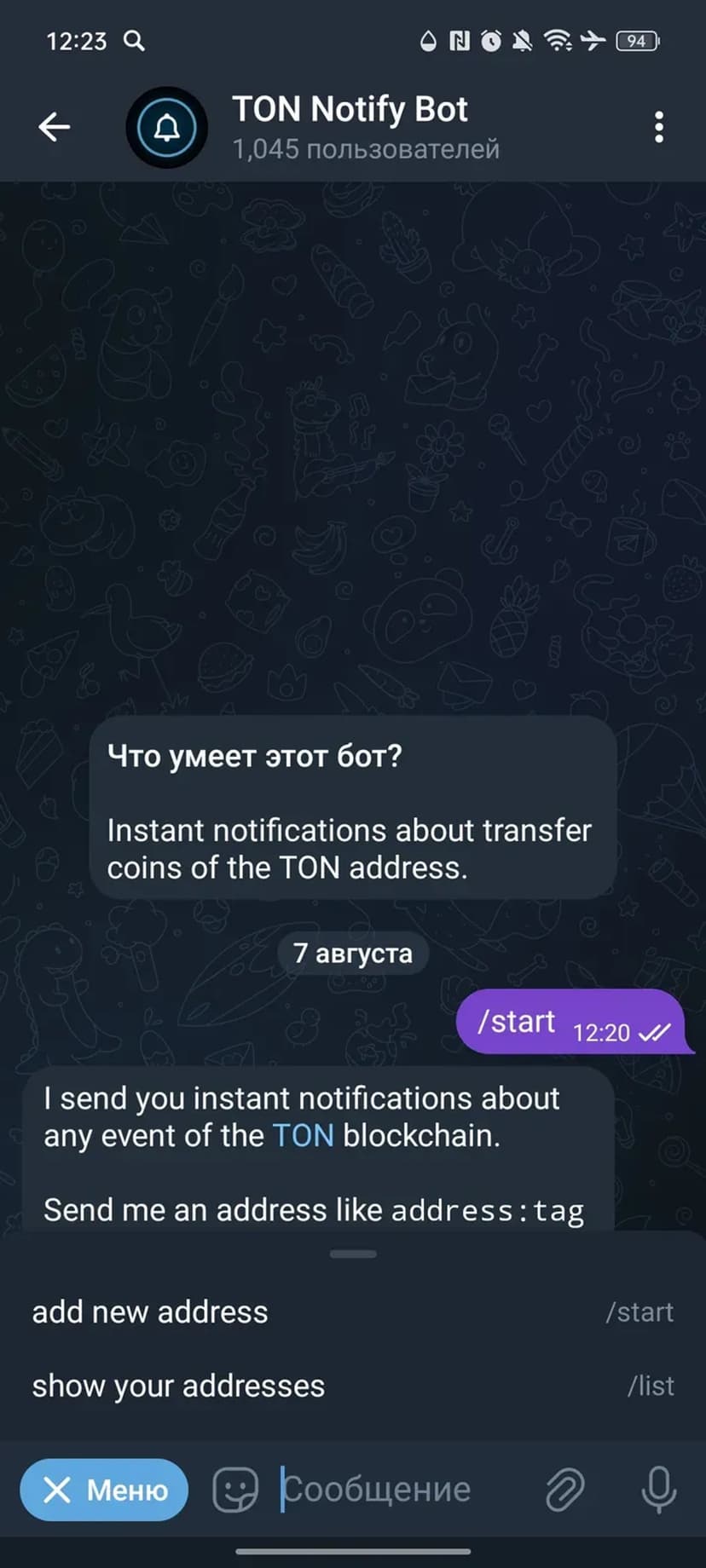 *Нажимая "Открыть в Telegram", вы перейдете к приложению TON Notify Bot в мессенджере Telegram