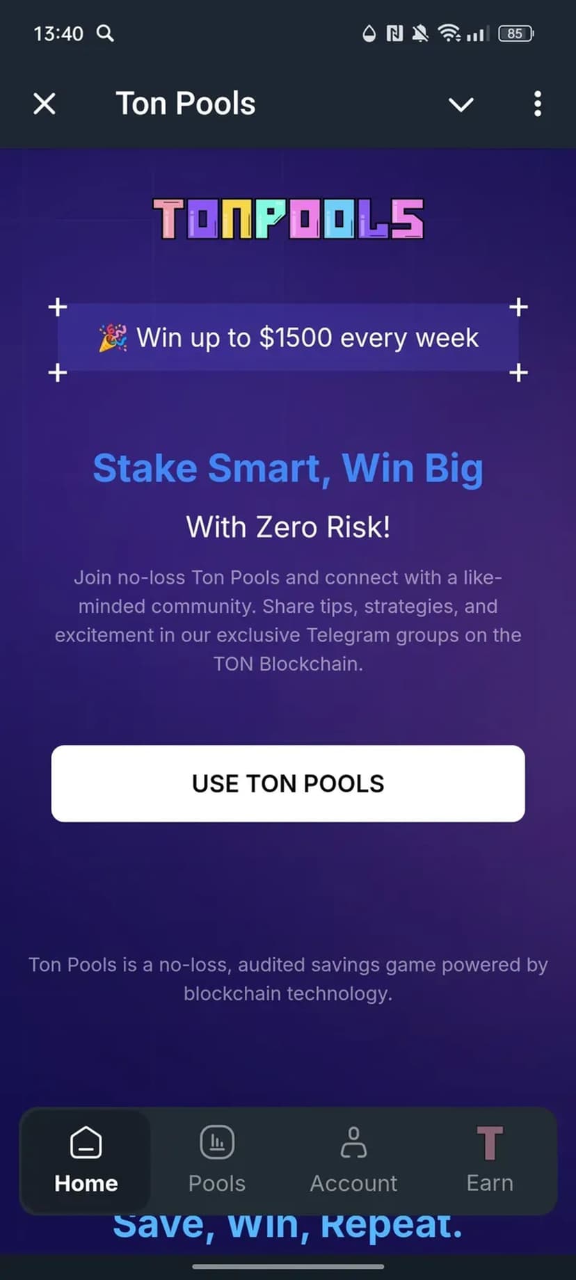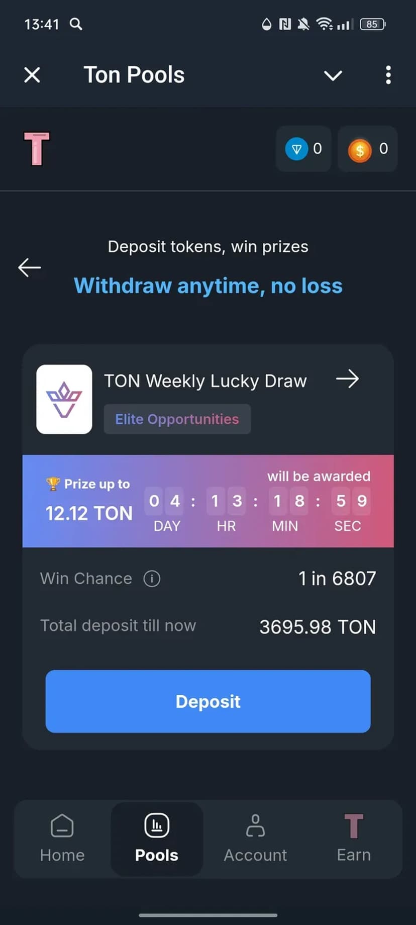 Ton Pools реализует модель prize-linked staking на стейкинге TON: участники складывают средства в общий пул и регулярно участвуют в розыгрышах, причём невыпавшие сохраняют свою первоначальную сумму.