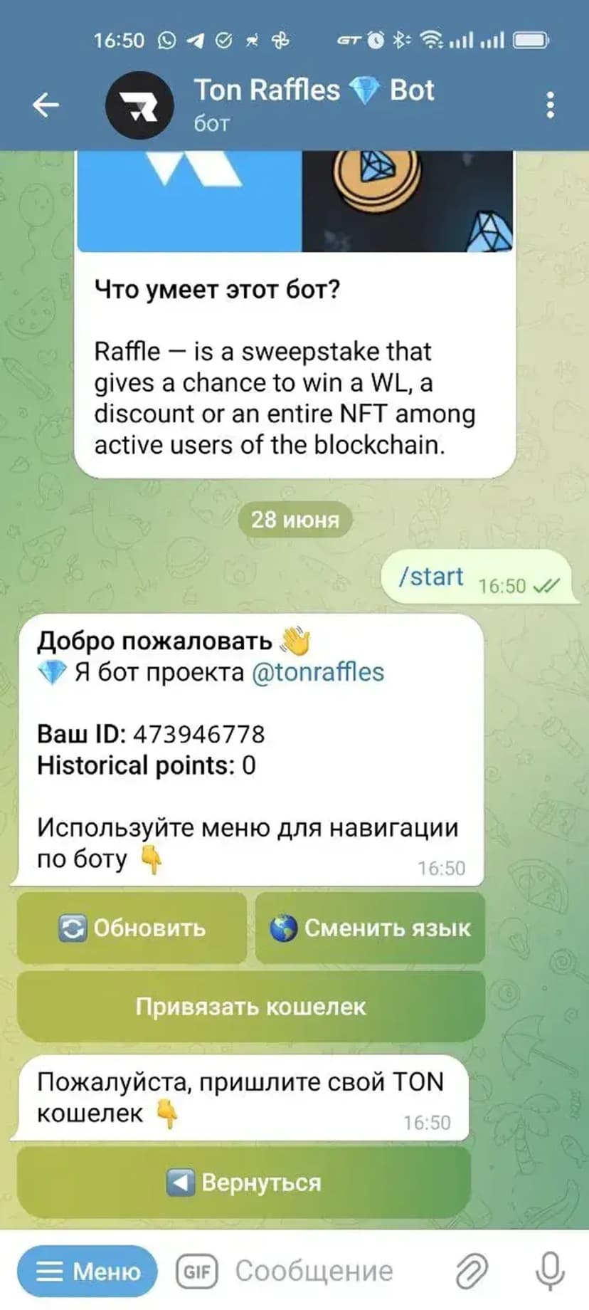 *Нажимая "Открыть в Telegram", вы перейдете к приложению Ton Raffles 💎 Bot в мессенджере Telegram