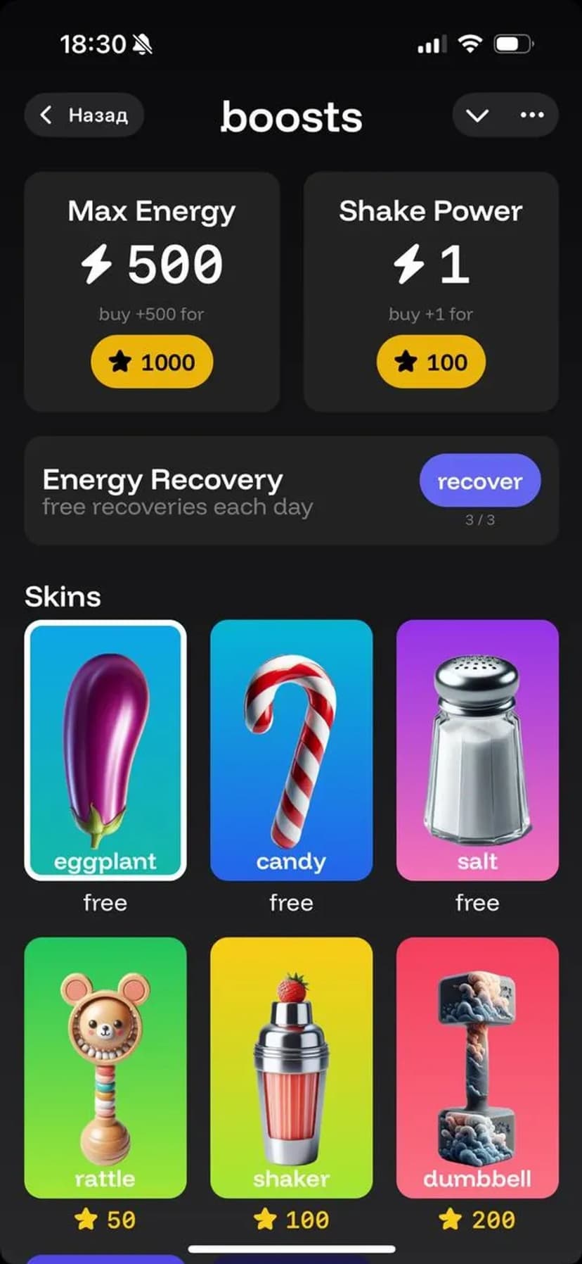 TON Shaker — мини‑игра на основе тряски устройства: запускайте шейкер, следите за счётчиком sTOSH и накапливайте внутриигровую валюту. В интерфейсе доступны кнопка старта, отображение накоплений и меню с привязкой кошелька, разделами апгрейдов, статистики и приглашений.