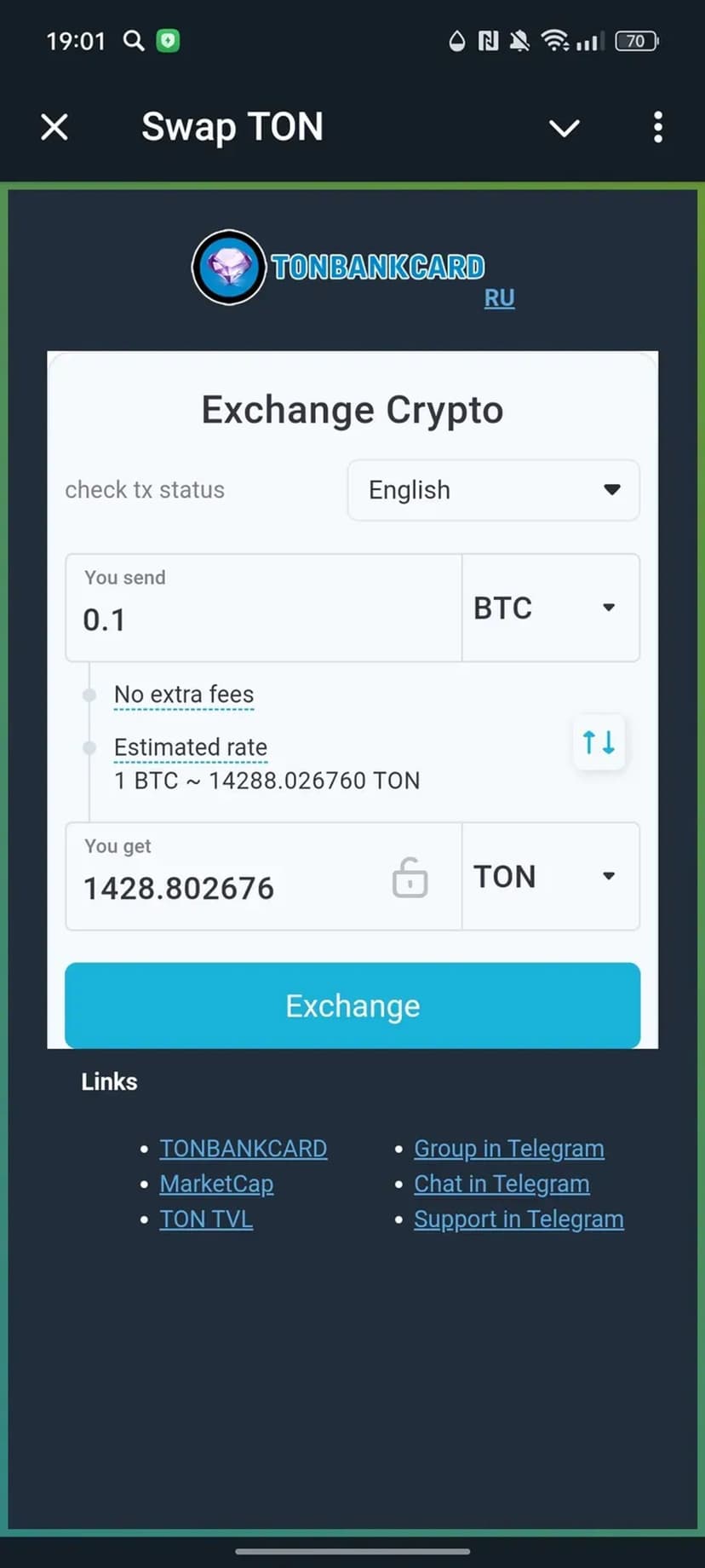 TON Swap — быстрый и анонимный обмен TON на другие валюты и обратно прямо в Telegram. Регистрация и ввод личных данных не требуются.